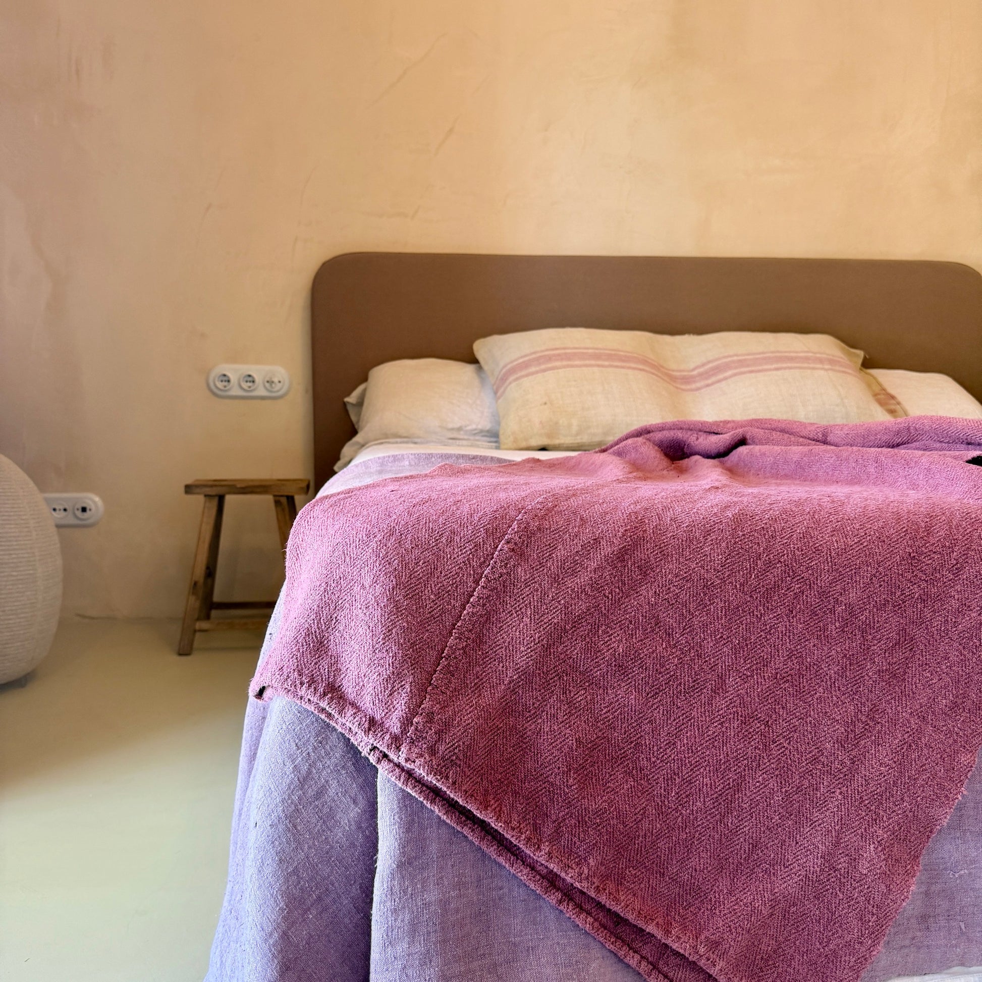 Lino vintage en un delicado tono rosado, ideal como mantel para el comedor o como colcha para una cama doble. Su textura envejecida aporta una caída natural con un aire rústico y elegante. En el dormitorio, nosotras lo combinamos con el cojín de lino con raya rosa.