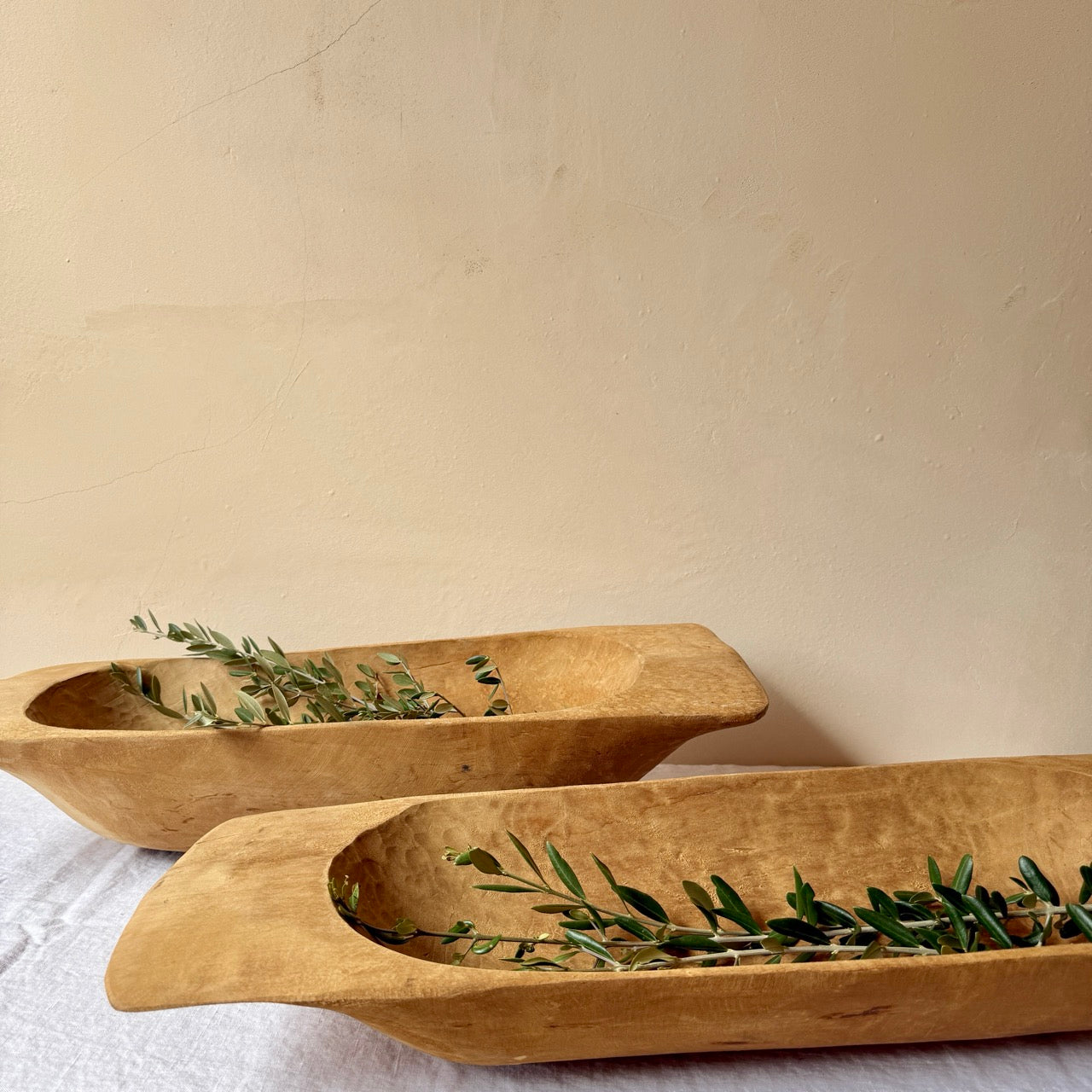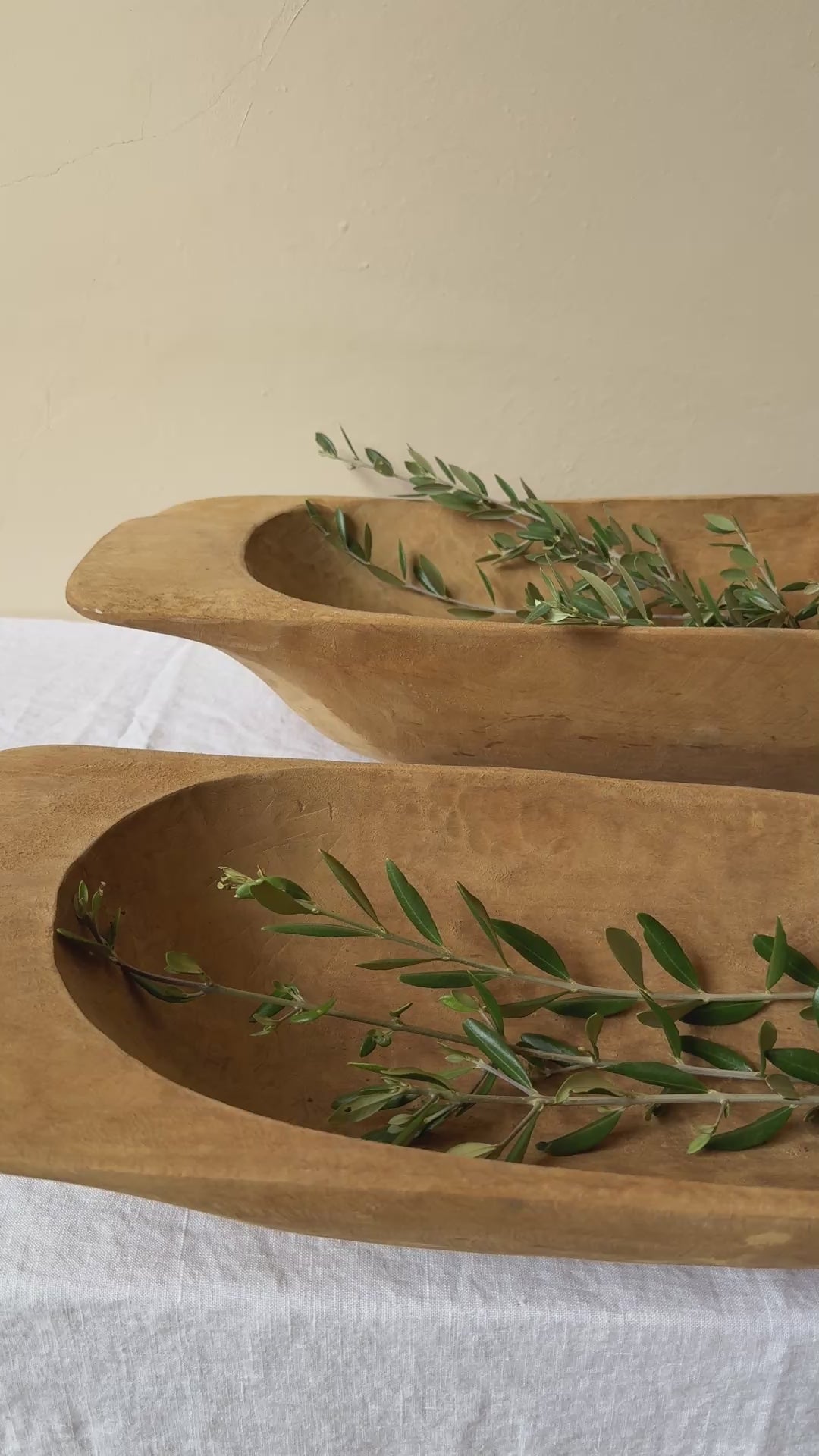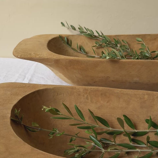 Bol o cuenco decorativo de madera antiguo. Estas piezas de madera antiguamente se usaban en Europa para amasar el pan. Su forma redondeada e irregular, hecha a mano, la convierten en una pieza única y especial. Nos encanta como centro de mesa.