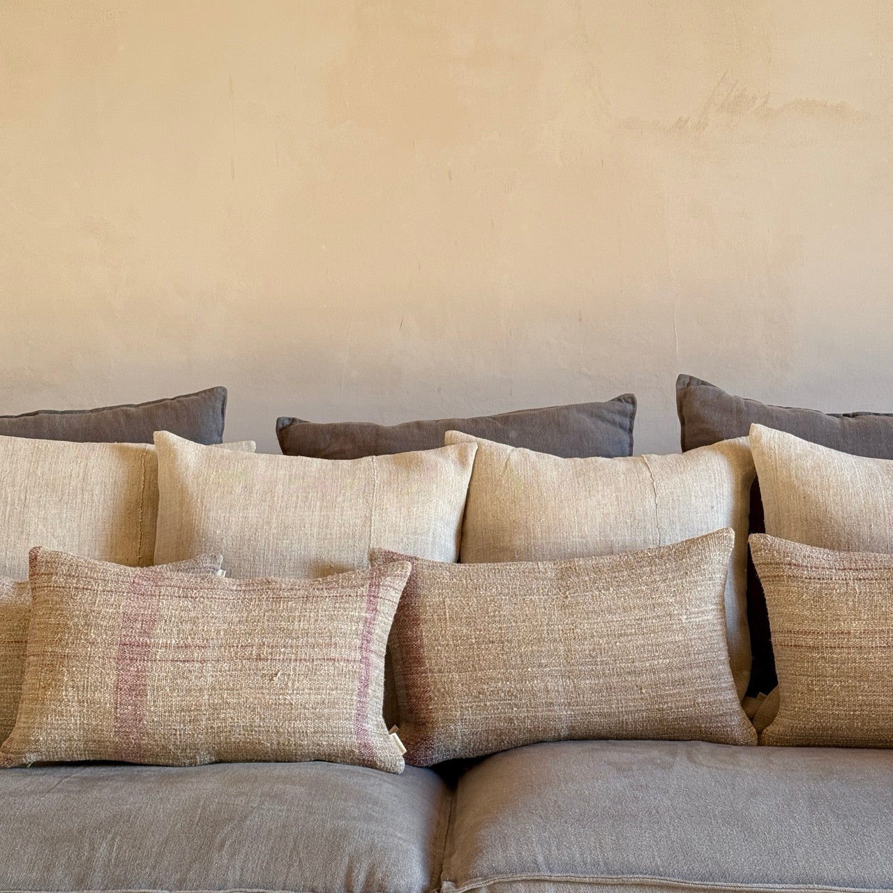 Cojín de lino vintage hecho a mano por una fundación sin ánimo de lucro que favorece la inserción laboral a personas con capacidades diferentes. Gracias a la naturaleza artesanal de este cojín, no hay dos iguales, lo que los convierte en piezas verdaderamente únicas.
