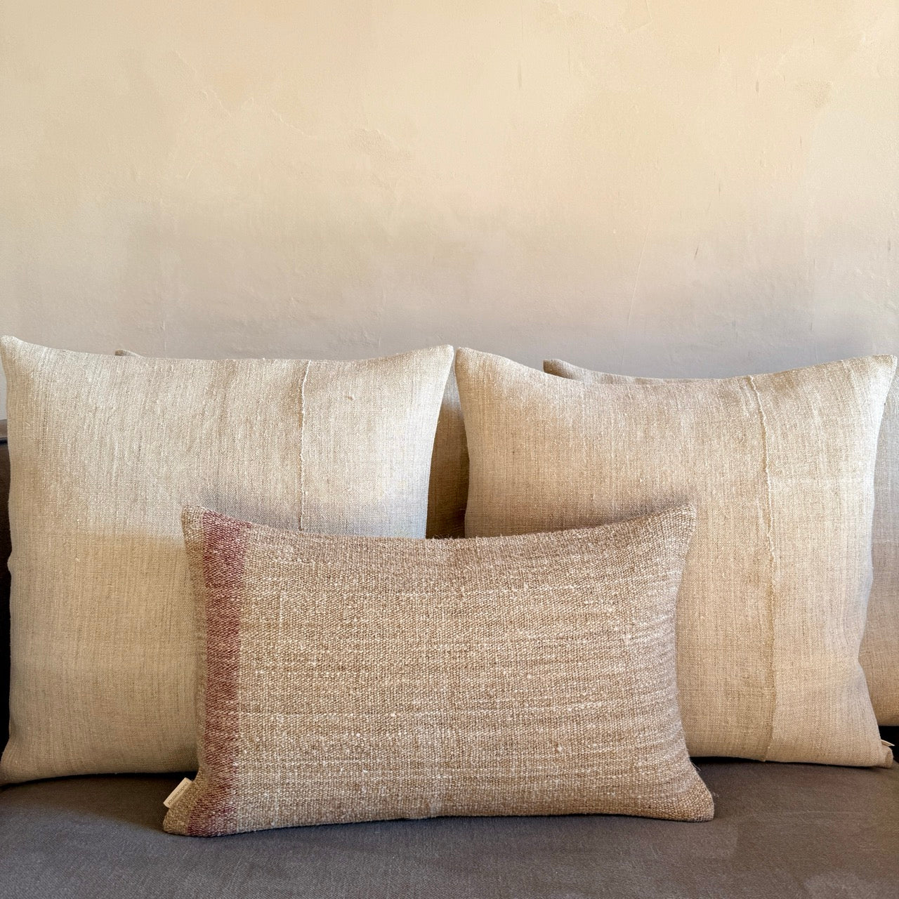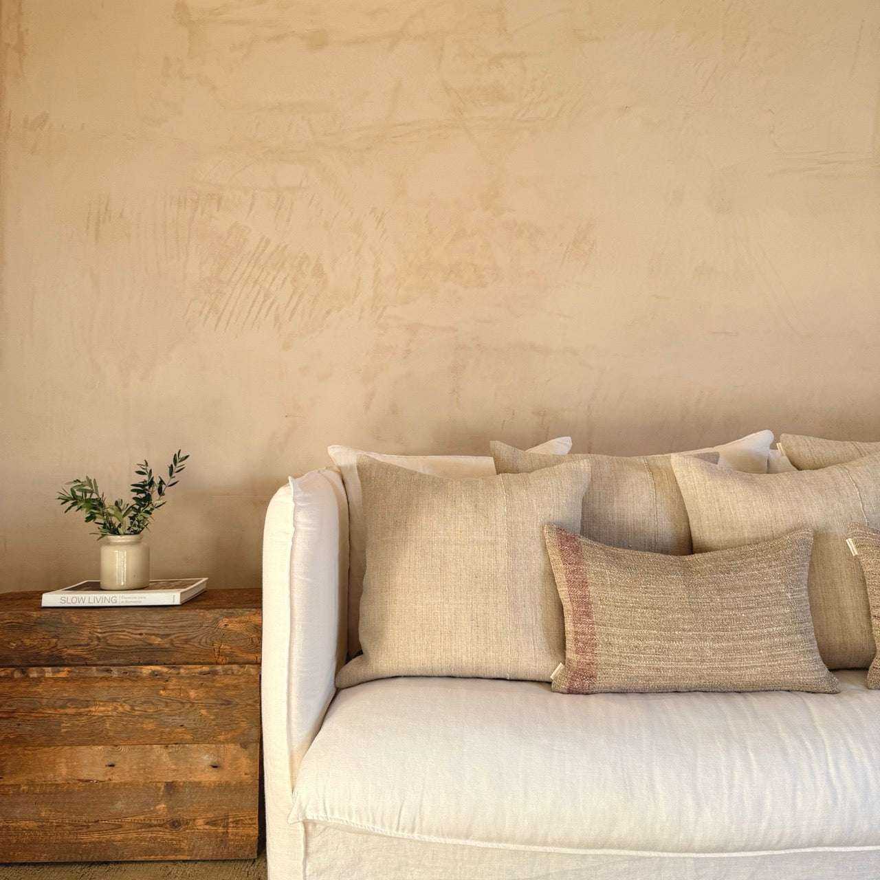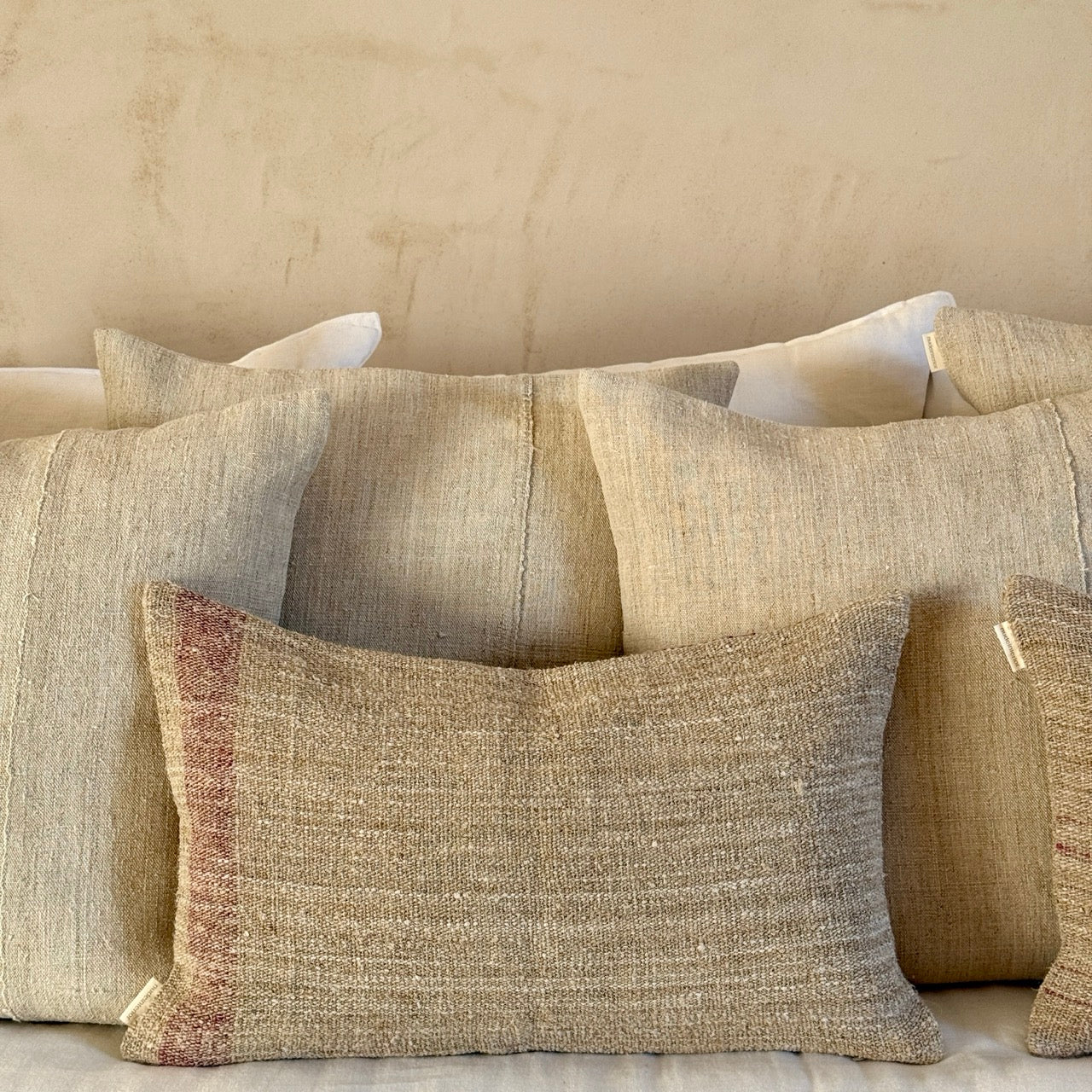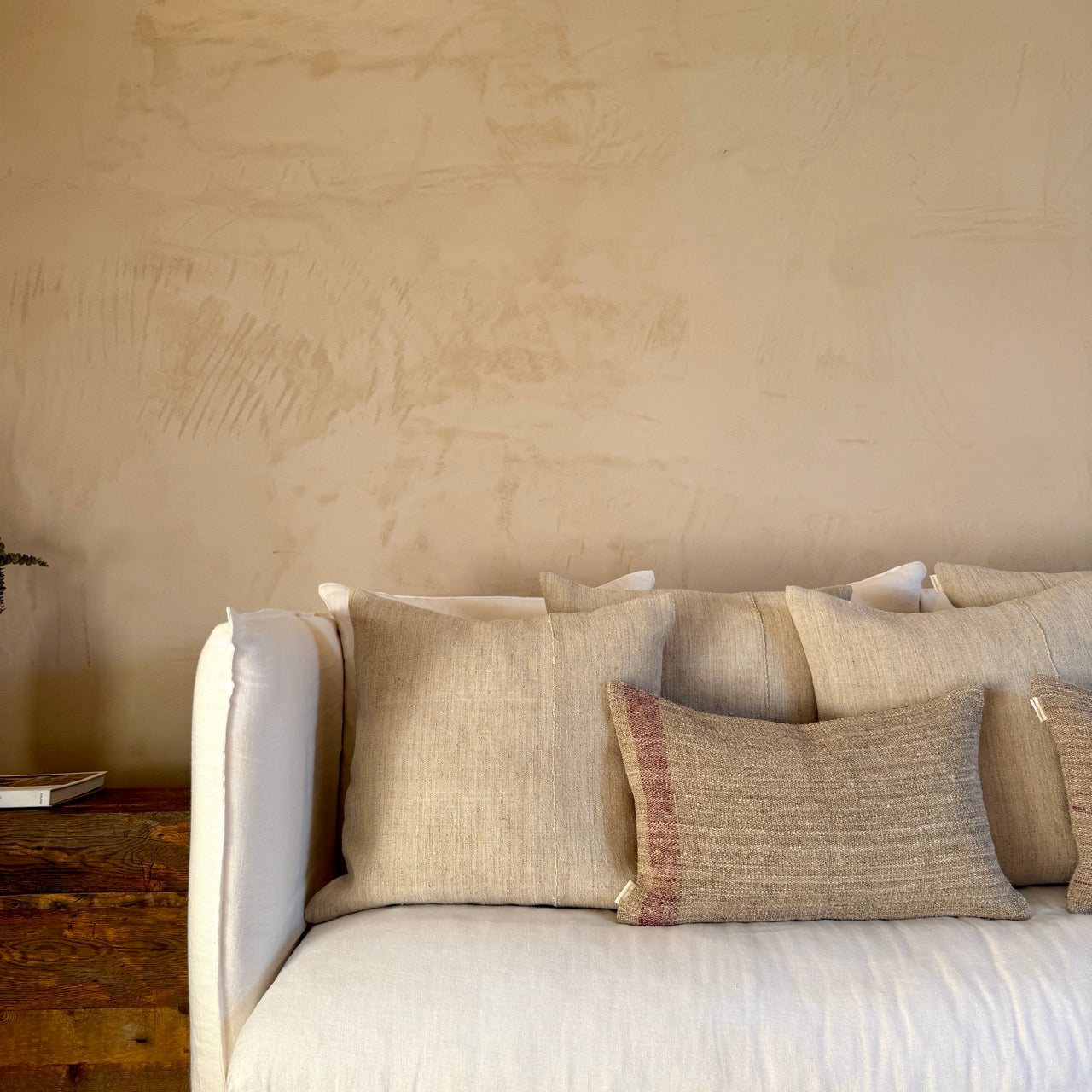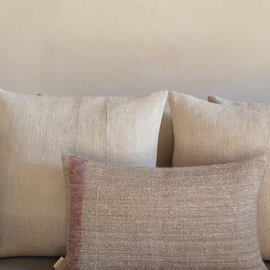 Cojín de lino vintage hecho a mano por una fundación sin ánimo de lucro que favorece la inserción laboral a personas con capacidades diferentes. Gracias a la naturaleza artesanal de este cojín, no hay dos iguales, lo que los convierte en piezas verdaderamente únicas.