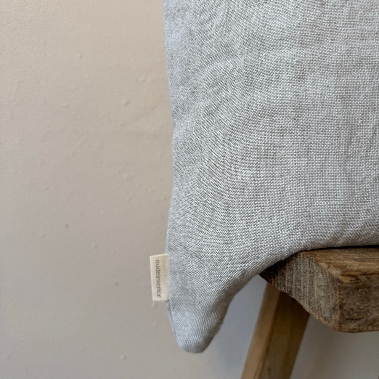 Funda de cojín elaborada en lino liso de color beige de alta calidad y con lazos de lino en uno de los lados para cerrarlo. Estas fundas de cojín llevan una solapa interior en el lado para que el relleno interior no queda a la vista. Estas piezas textiles están hechas a mano por una fundación sin ánimo de lucro que favorece la inserción laboral a personas con capacidades diferentes.