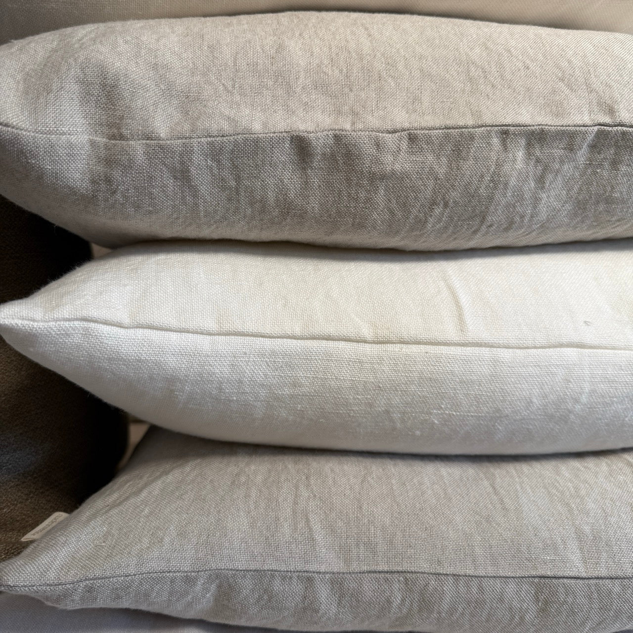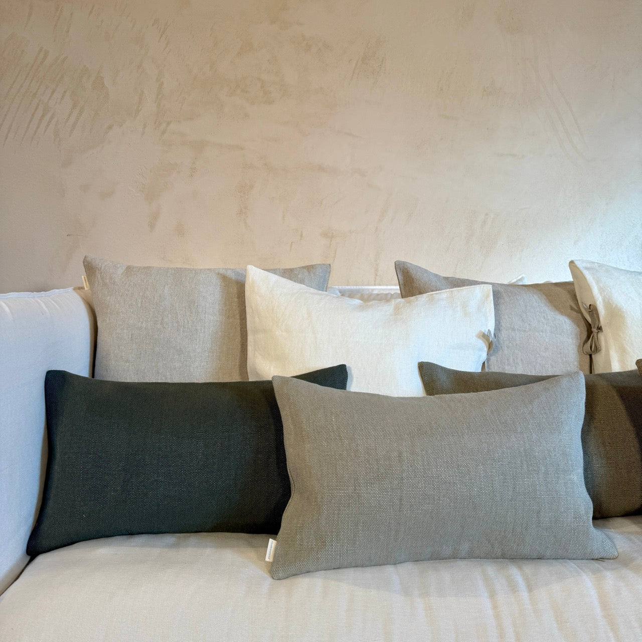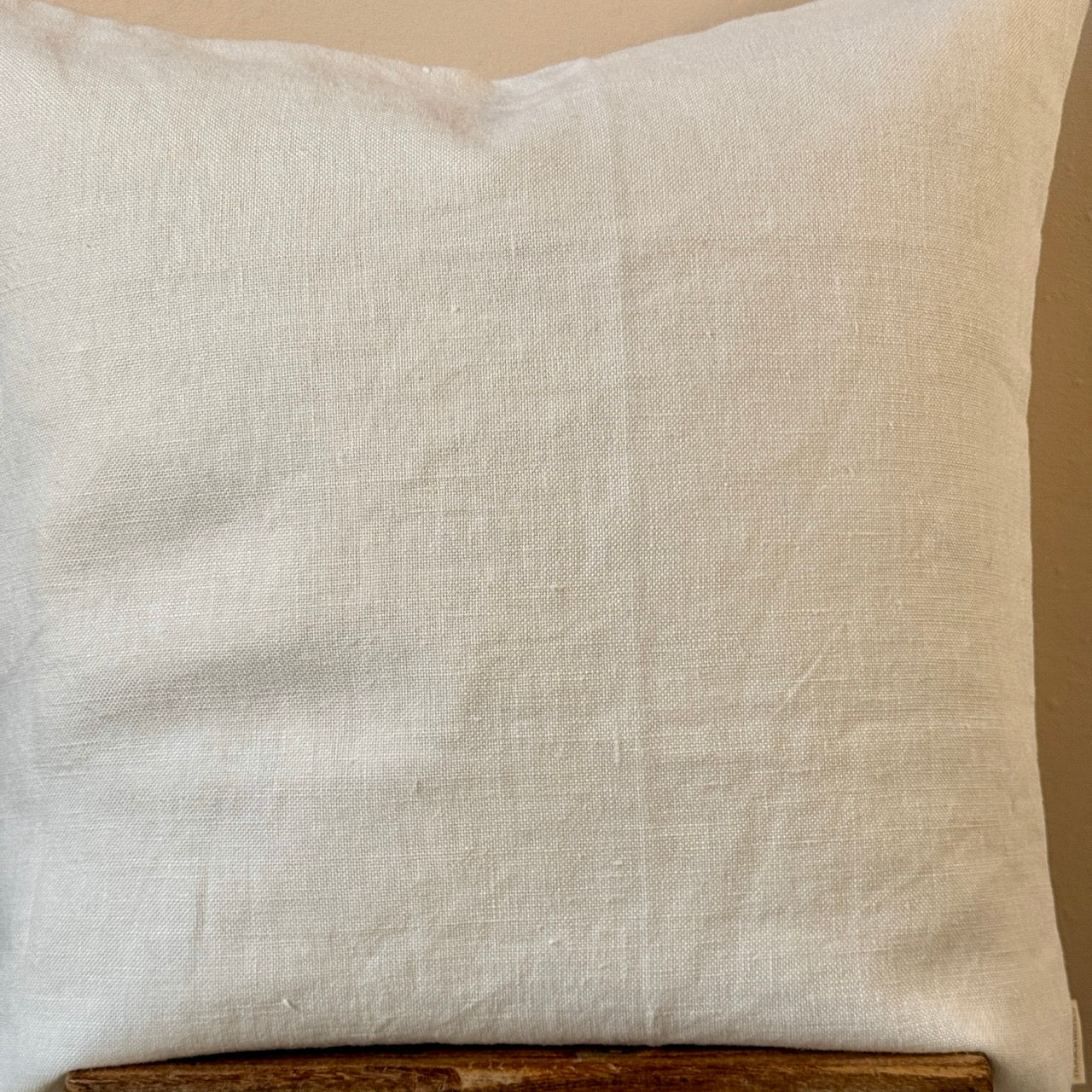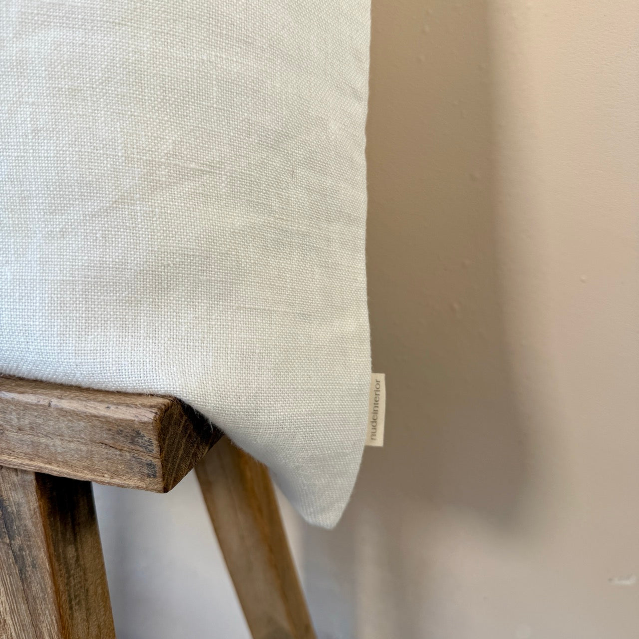 Funda de cojín elaborada en lino liso de color blanco de alta calidad y con lazos de lino color beige en uno de los lados para cerrarlo. Estas fundas de cojín llevan una solapa interior en el lado para que el relleno interior no queda a la vista. Estas piezas textiles están hechas a mano por una fundación sin ánimo de lucro que favorece la inserción laboral a personas con capacidades diferentes.