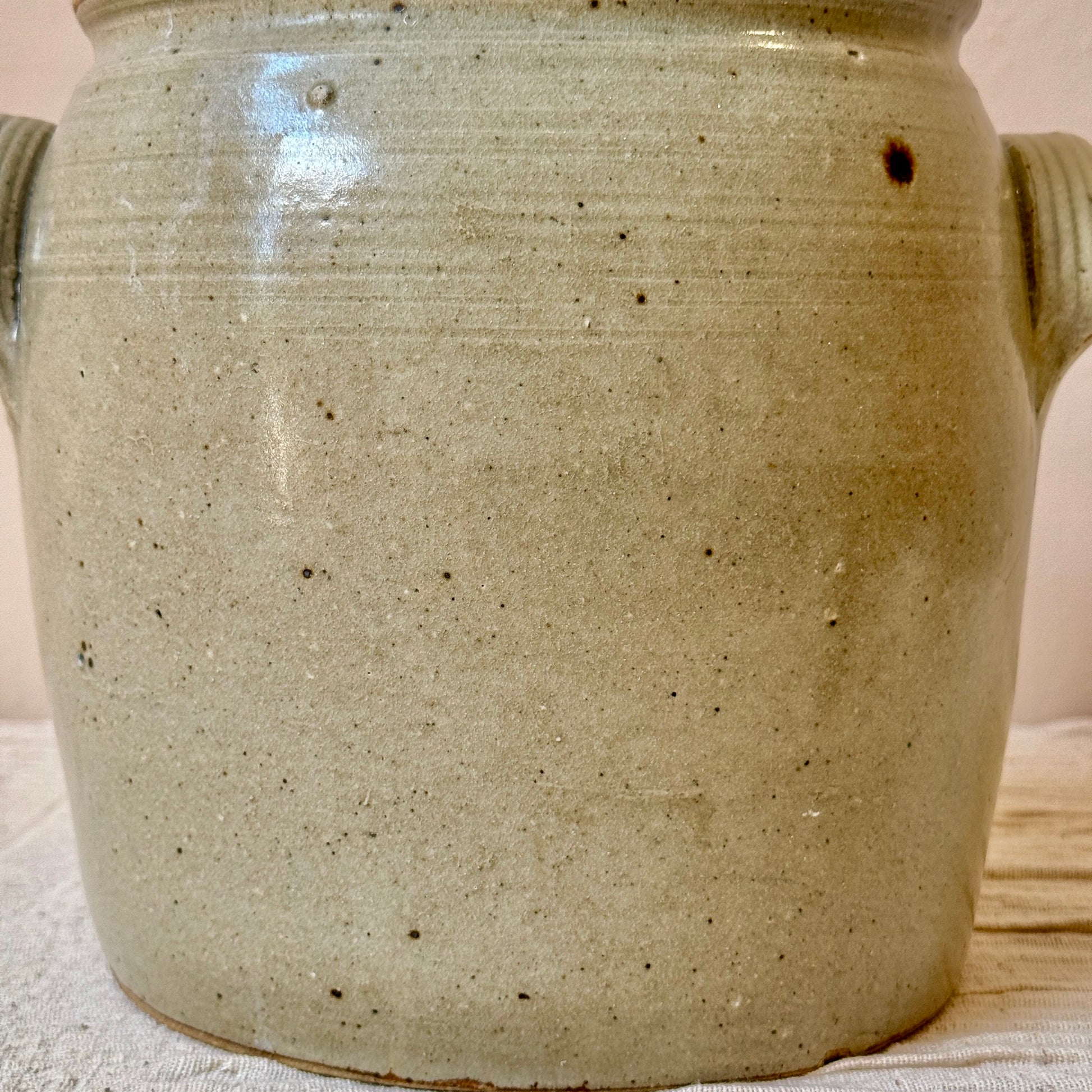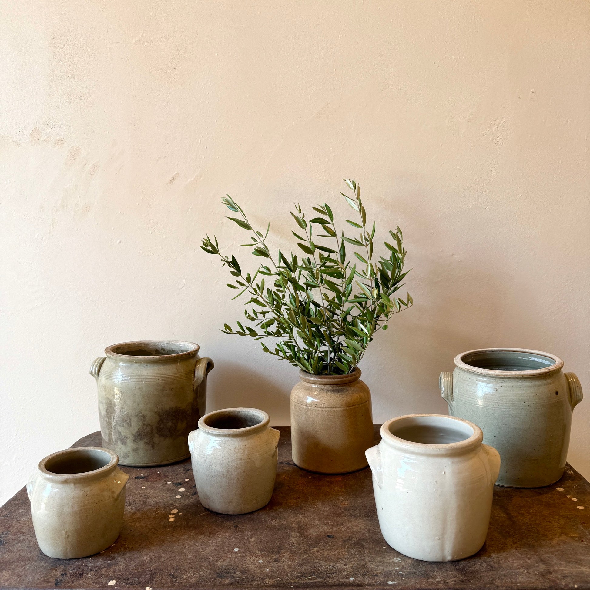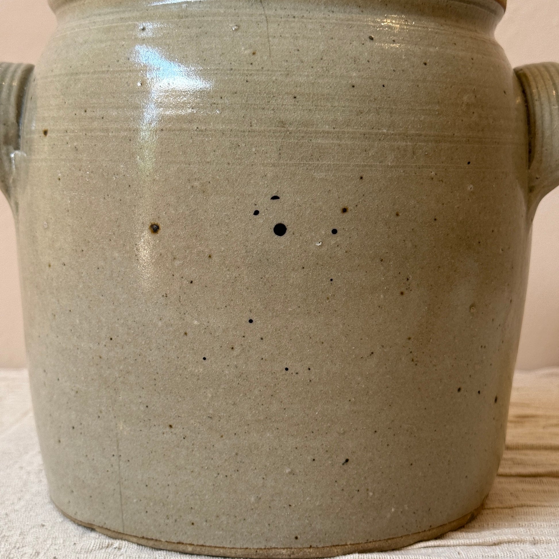 Jarrón de cerámica antiguo francés del siglo XIX. Originalmente se usaban para conservar alimentos en la campiña francesa. Son ideales tanto una pieza sola como la mezcla de varios tamaños y colores juntos. Perfecto para usar como jarrón con flores, para poner los utensilios en la cocina o simplemente como pieza decorativa. Este en concreto es sin duda uno de nuestros favoritos, tiene estas manchas como pecas que lo hacen muy especial.