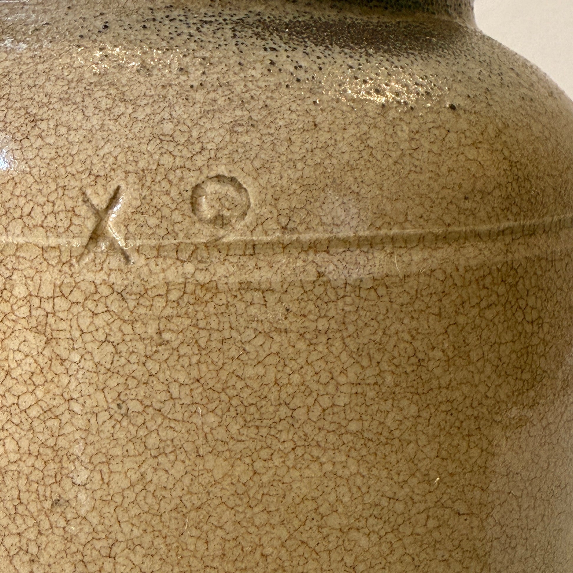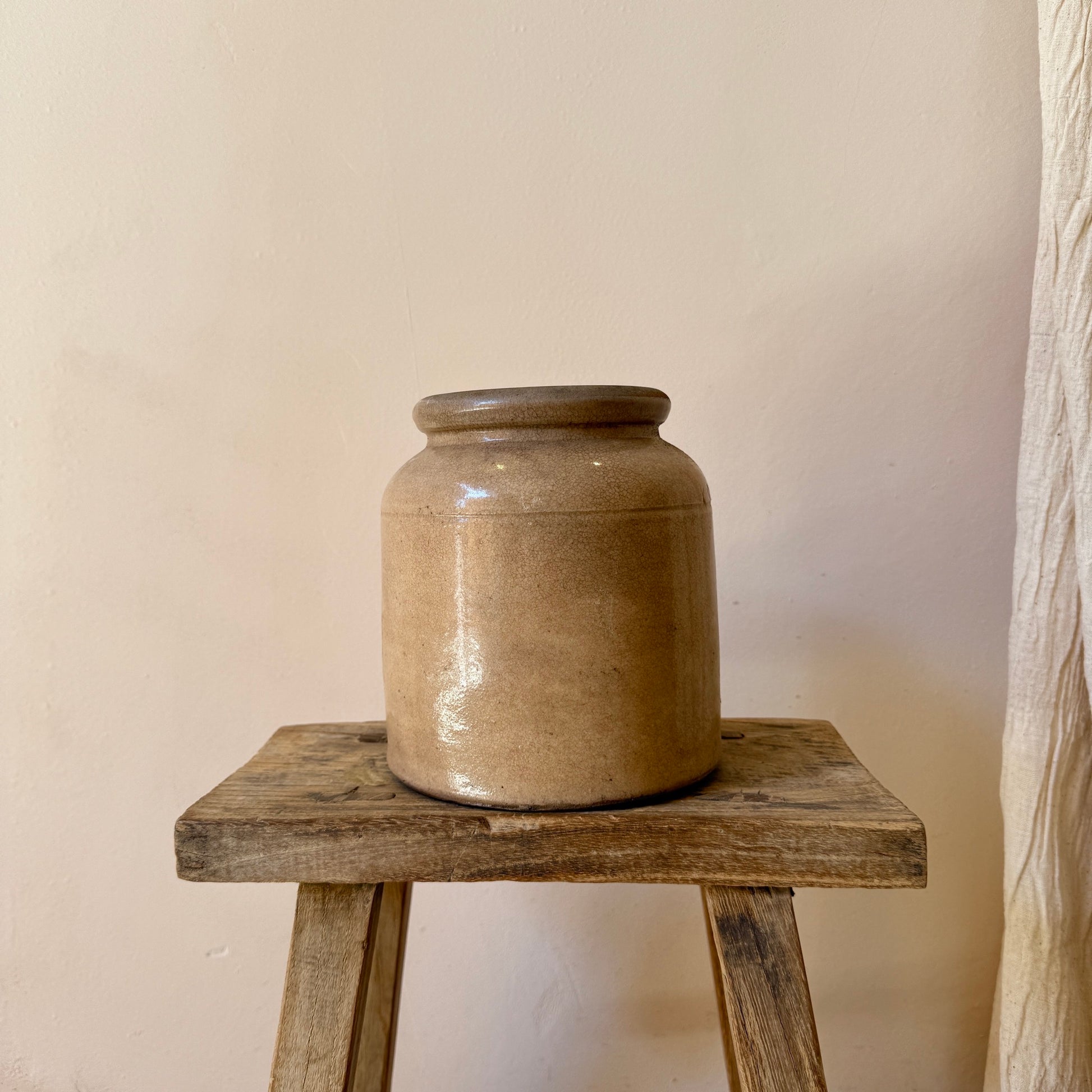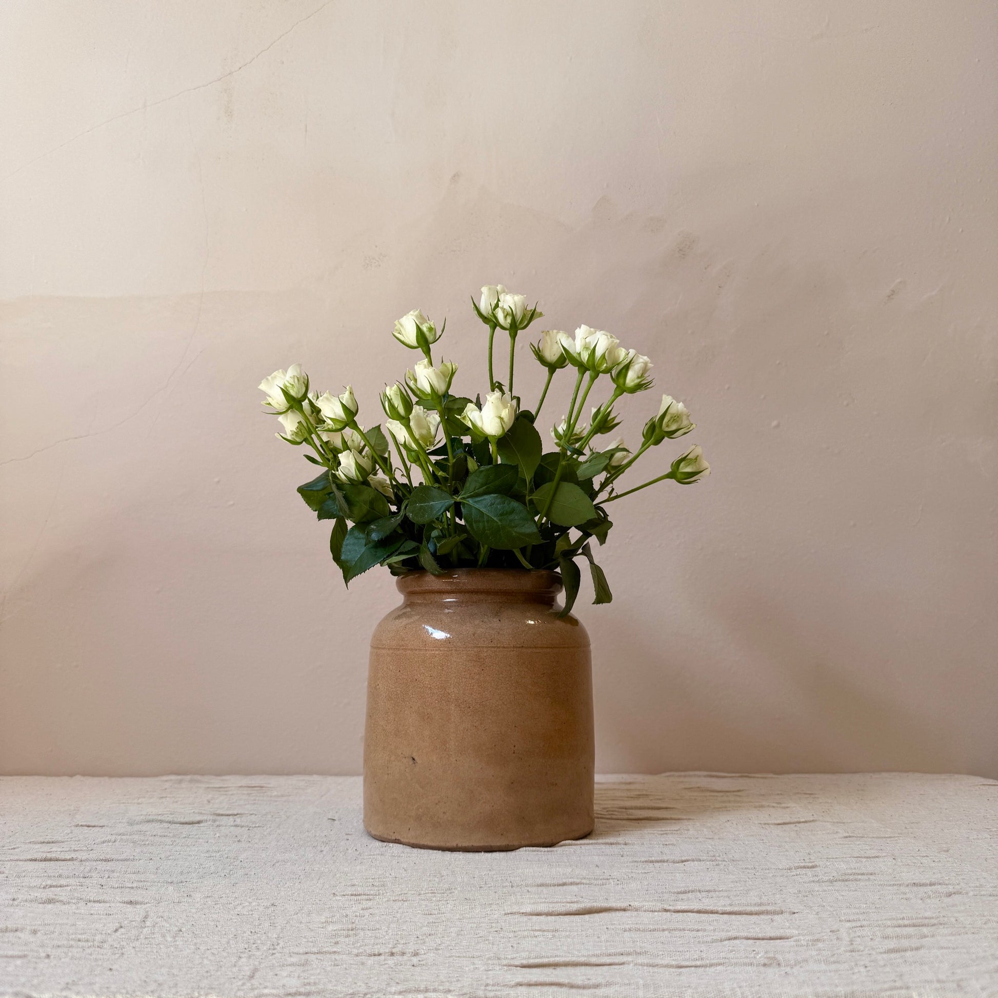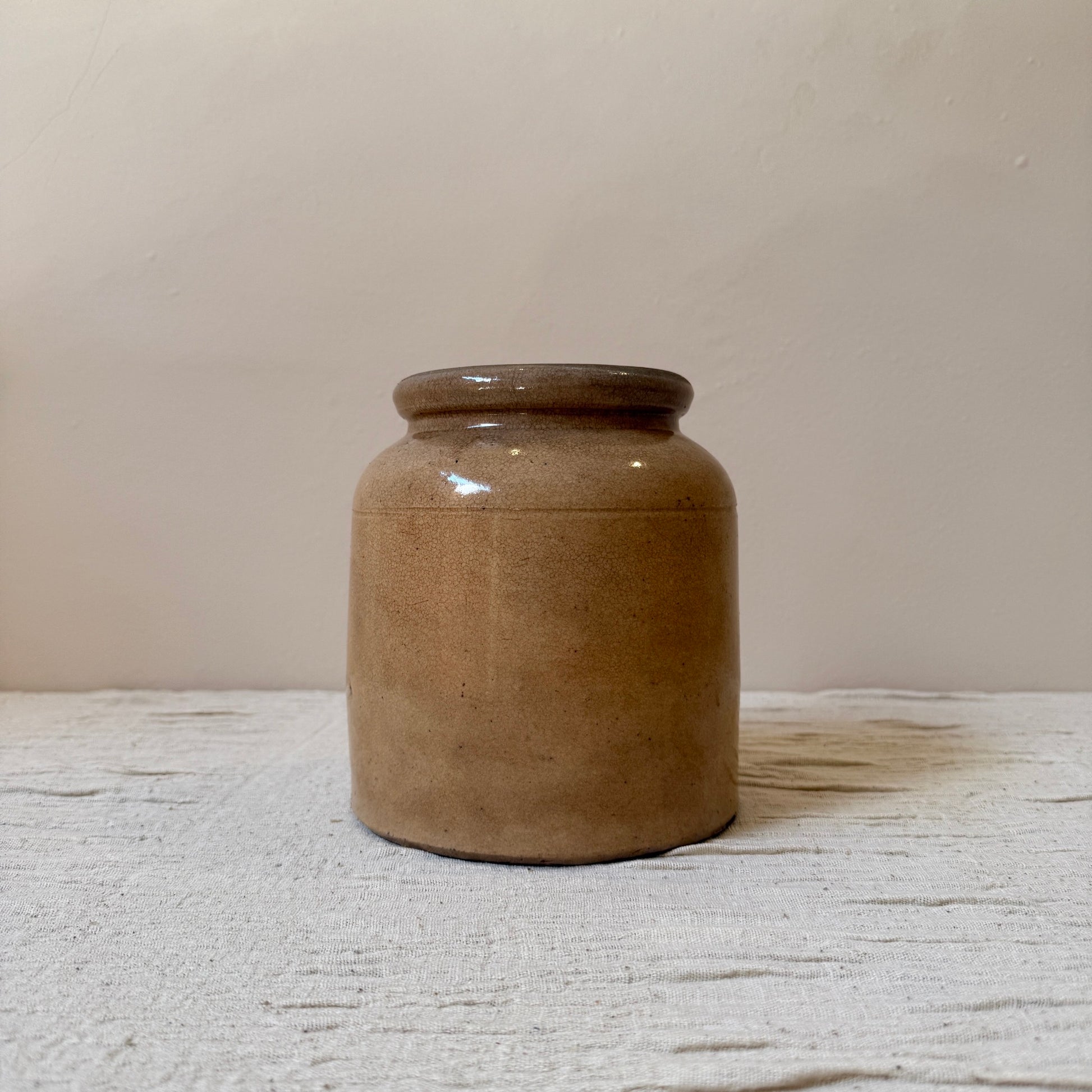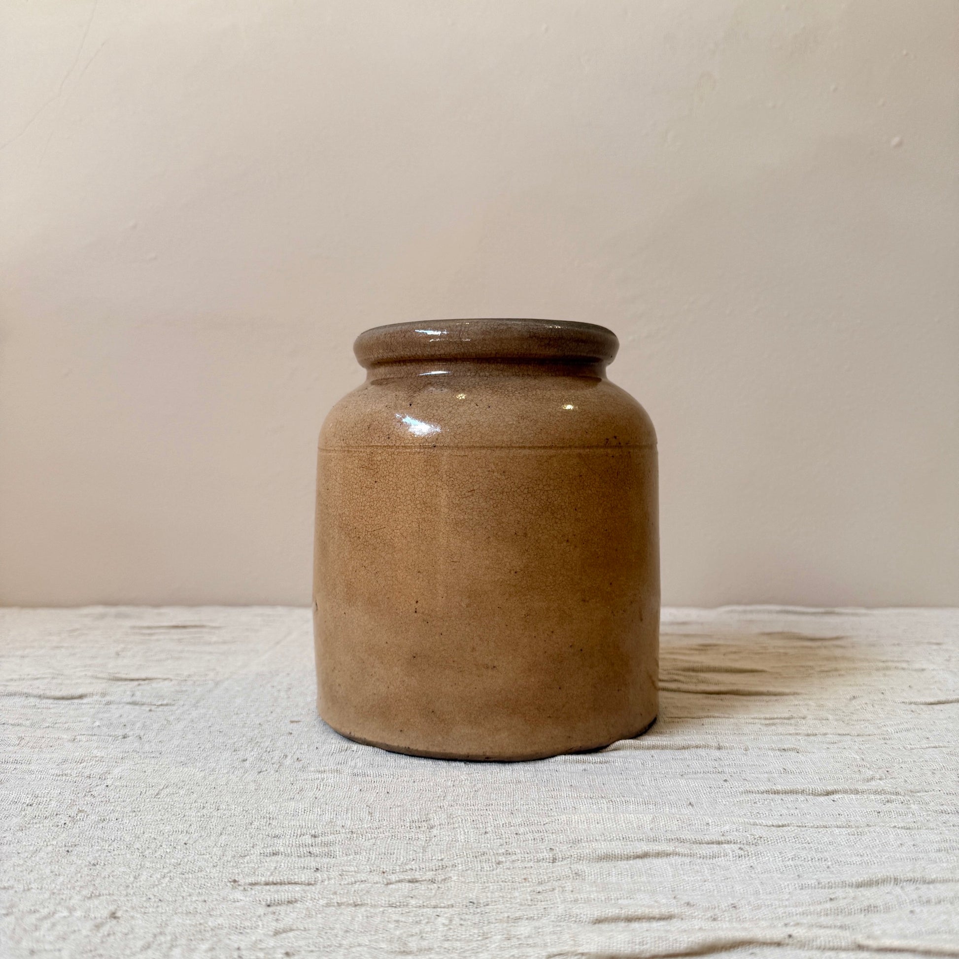 Jarrón de cerámica antiguo francés del siglo XIX. Originalmente se usaban para conservar alimentos en la campiña francesa. Son ideales tanto una pieza sola como la mezcla de varios tamaños y colores juntos. Perfecto para usar como jarrón con flores, para poner los utensilios en la cocina o simplemente como pieza decorativa.