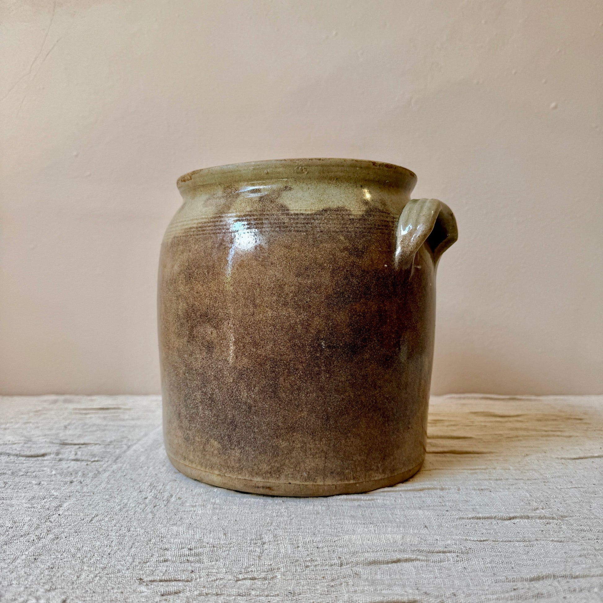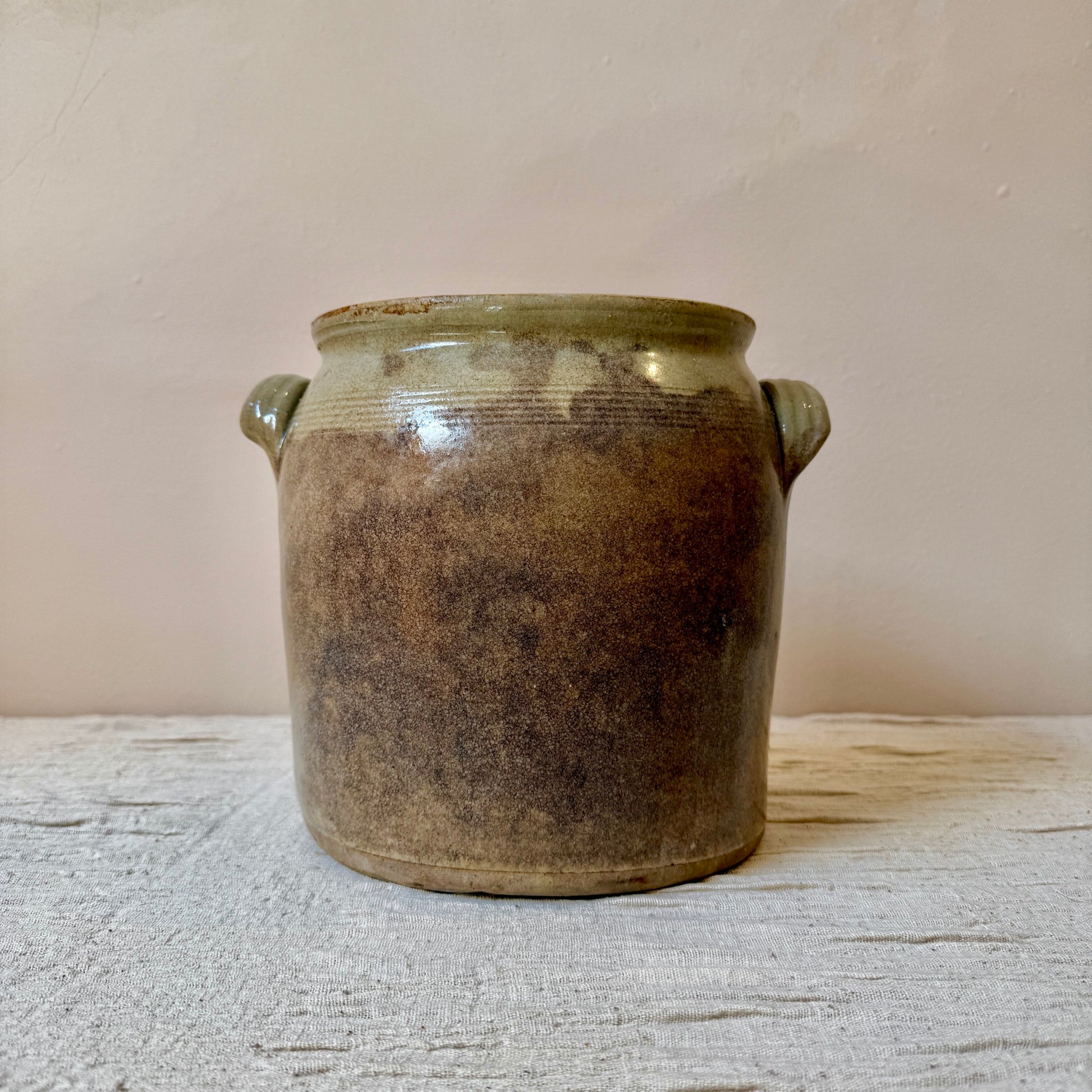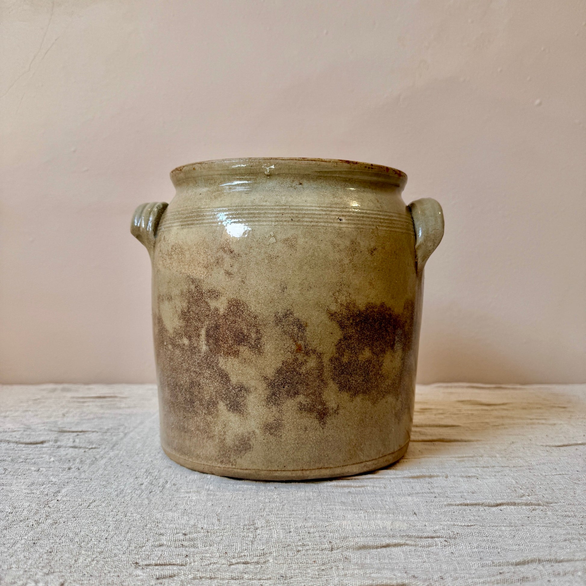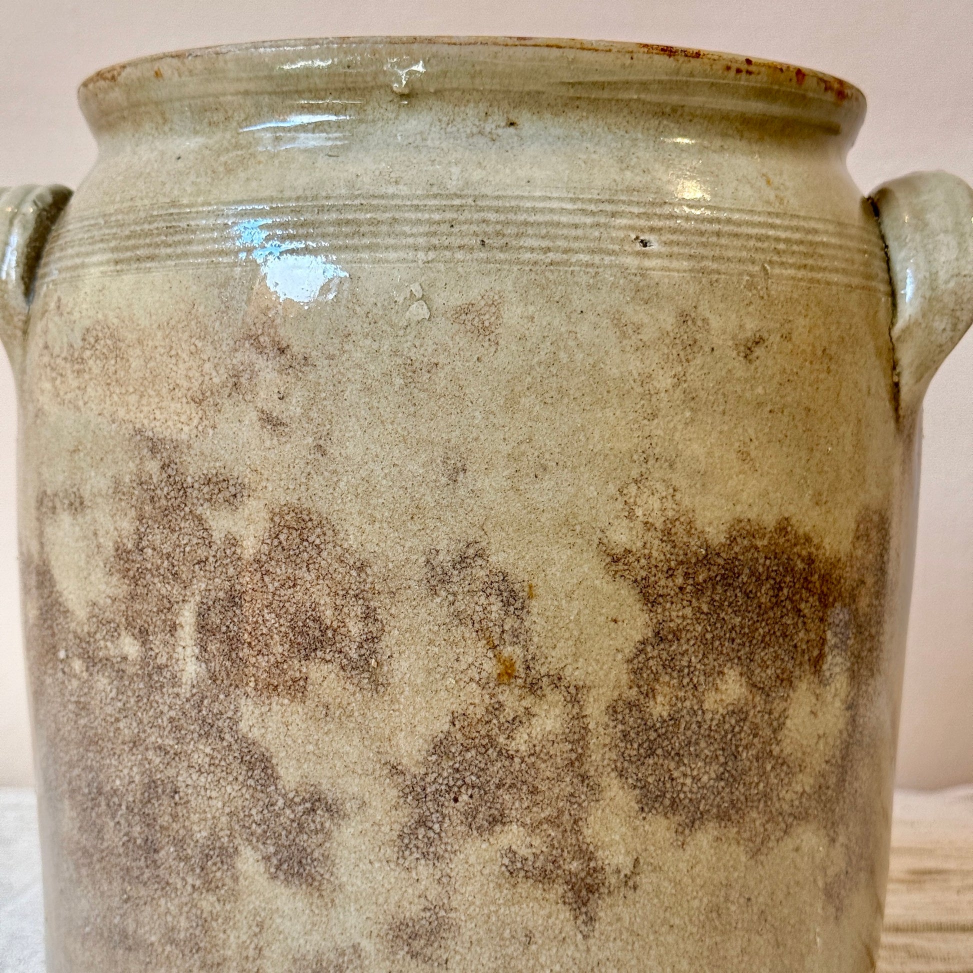 Jarrón de cerámica antiguo francés del siglo XIX. Originalmente se usaban para conservar alimentos en la campiña francesa. Son ideales tanto una pieza sola como la mezcla de varios tamaños y colores juntos. Perfecto para usar como jarrón con flores, para poner los utensilios en la cocina o simplemente como pieza decorativa. Este es sin duda uno de nuestros favoritos, tiene estas manchas irregulares en dos colores que lo hacen muy especial.