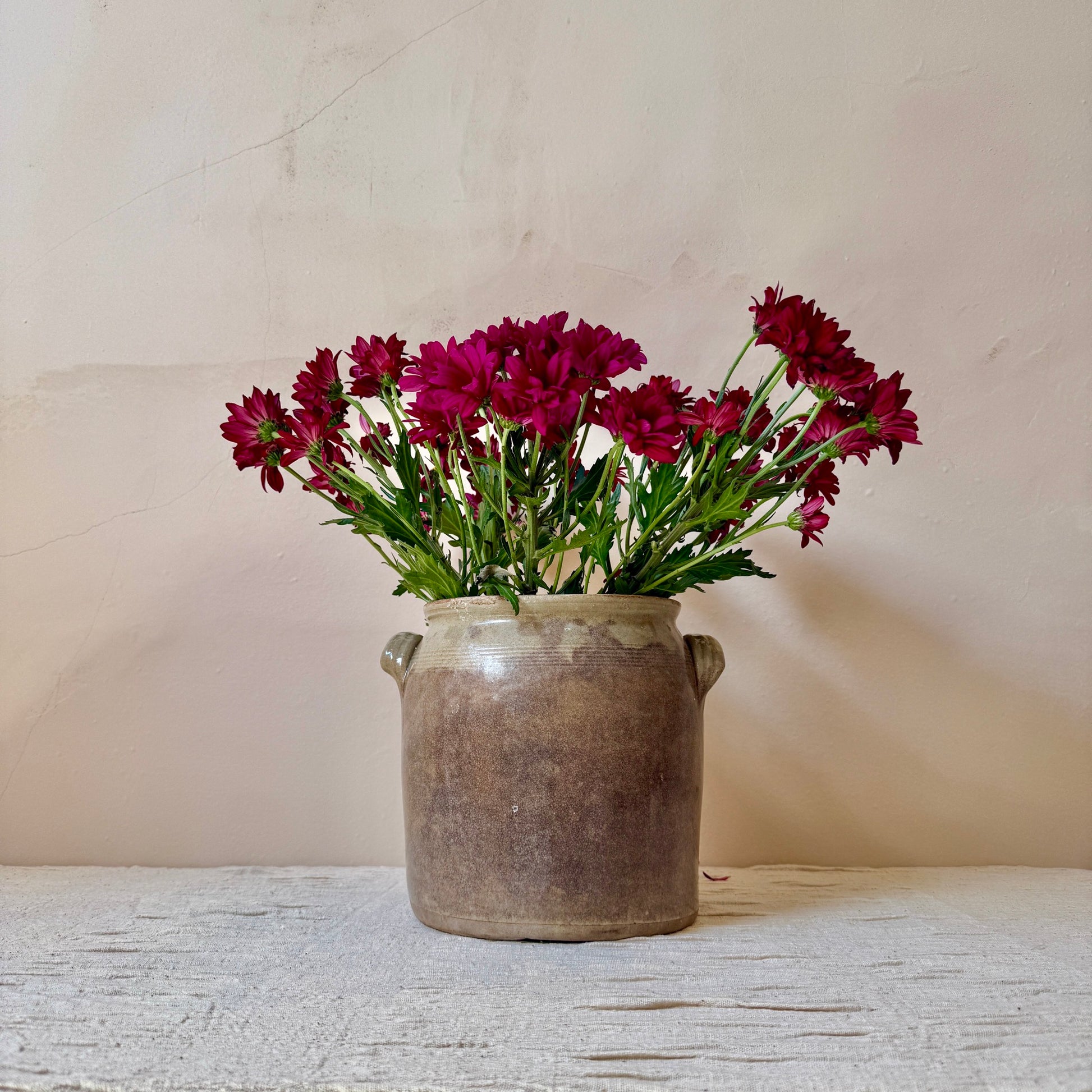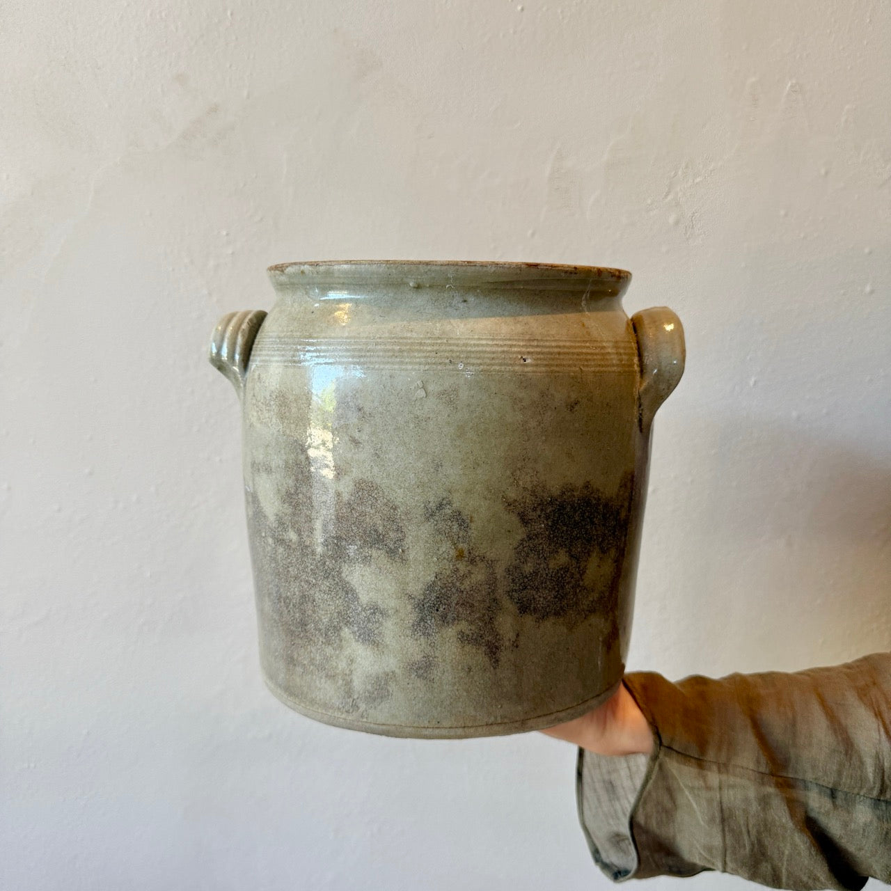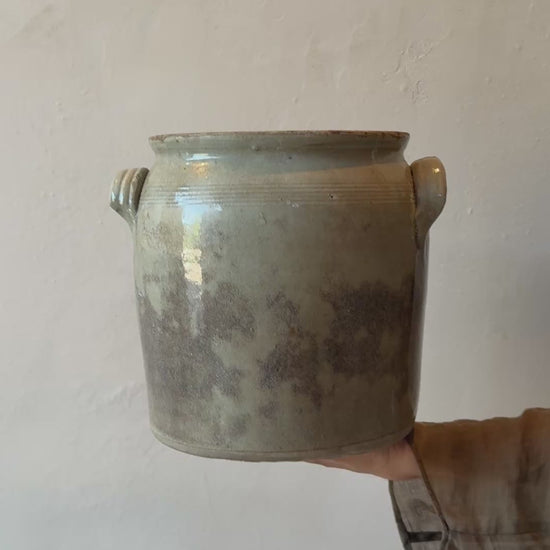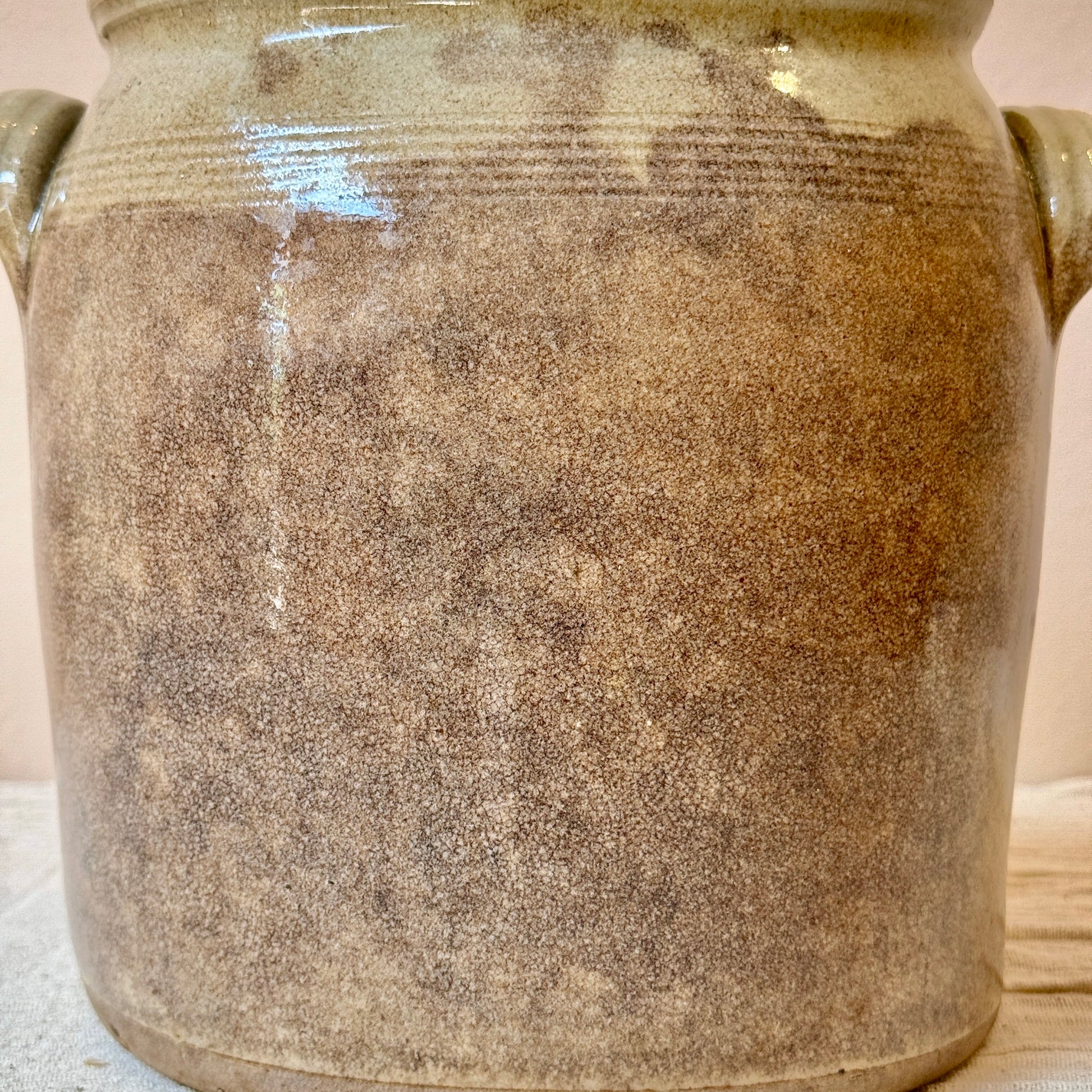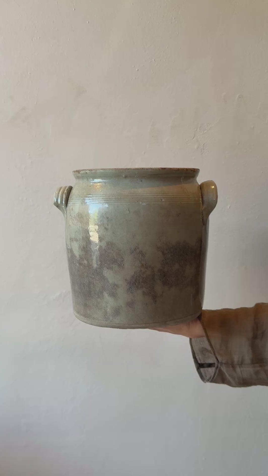 Jarrón de cerámica antiguo francés del siglo XIX. Originalmente se usaban para conservar alimentos en la campiña francesa. Son ideales tanto una pieza sola como la mezcla de varios tamaños y colores juntos. Perfecto para usar como jarrón con flores, para poner los utensilios en la cocina o simplemente como pieza decorativa. Este es sin duda uno de nuestros favoritos, tiene estas manchas irregulares en dos colores que lo hacen muy especial.