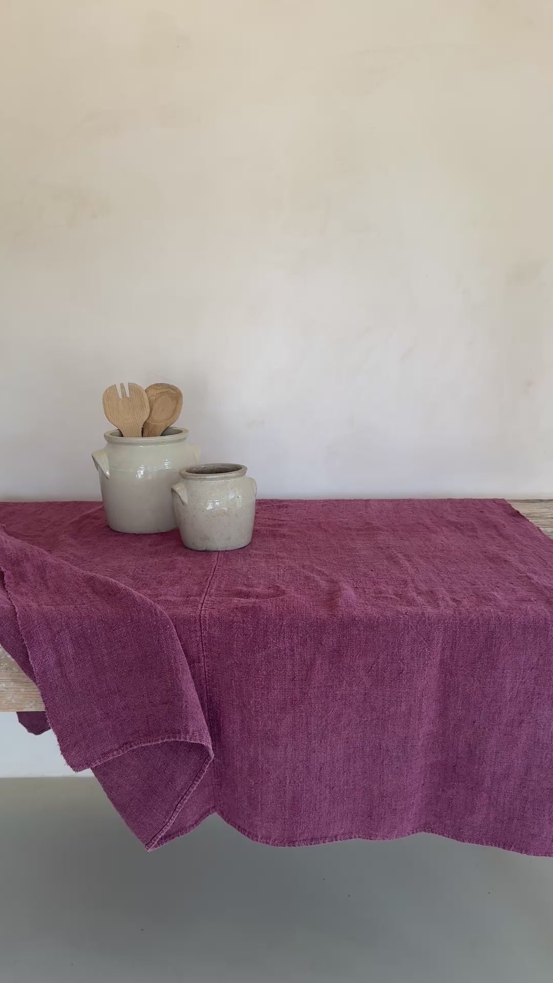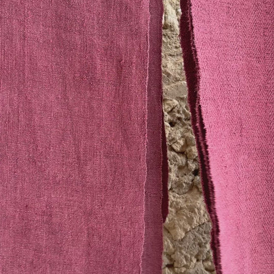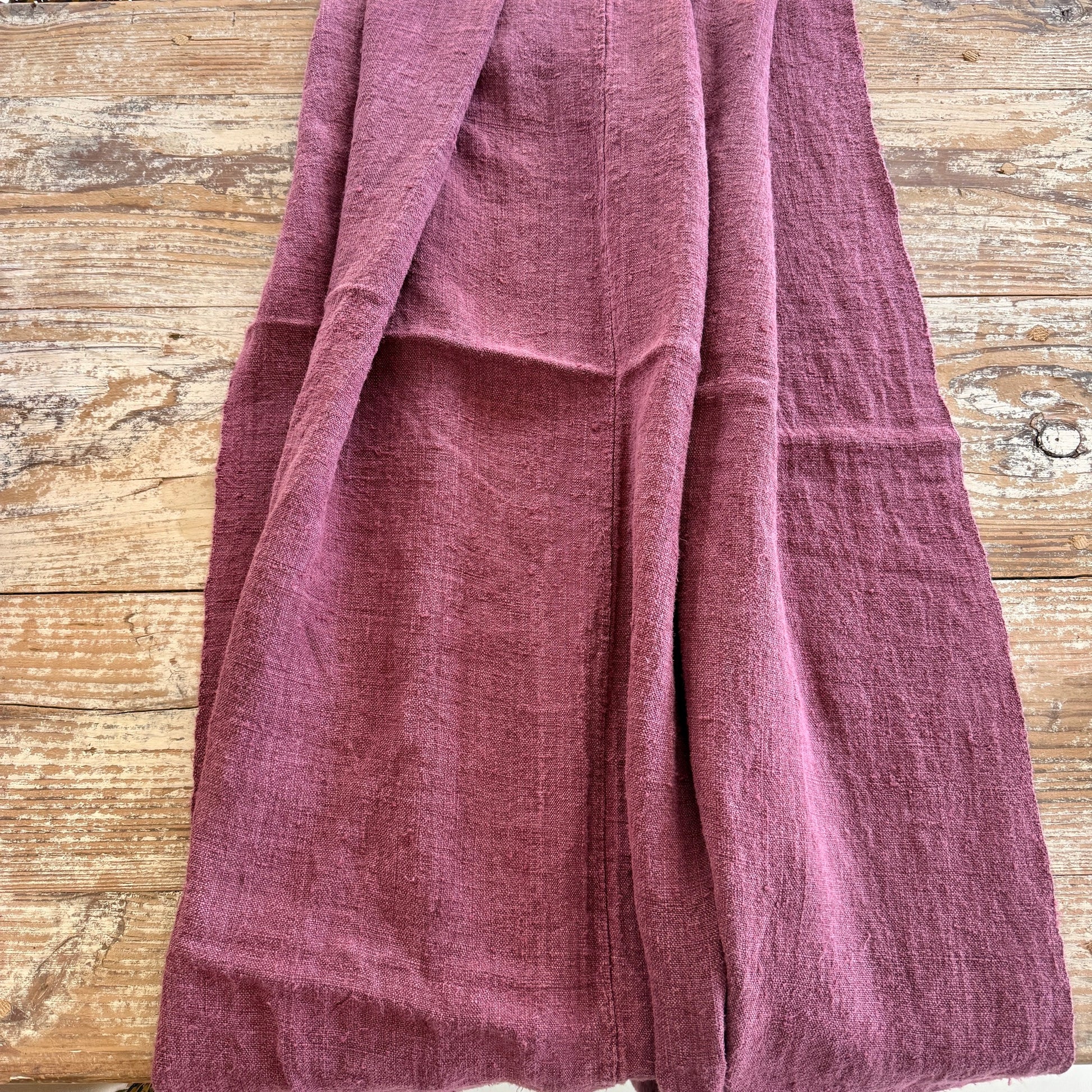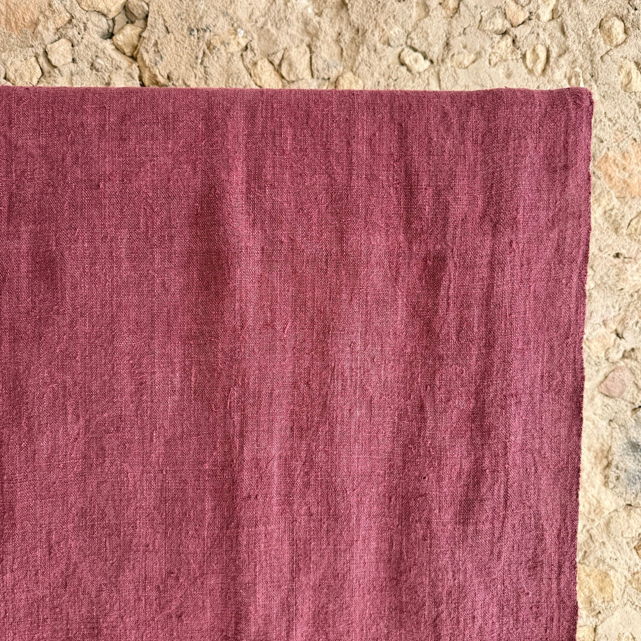 Lino vintage en un delicado tono rosado, ideal como mantel para el comedor, como colcha para una cama individual o como plaid en un sofá. Su textura envejecida aporta una caída natural con un aire rústico y elegante.