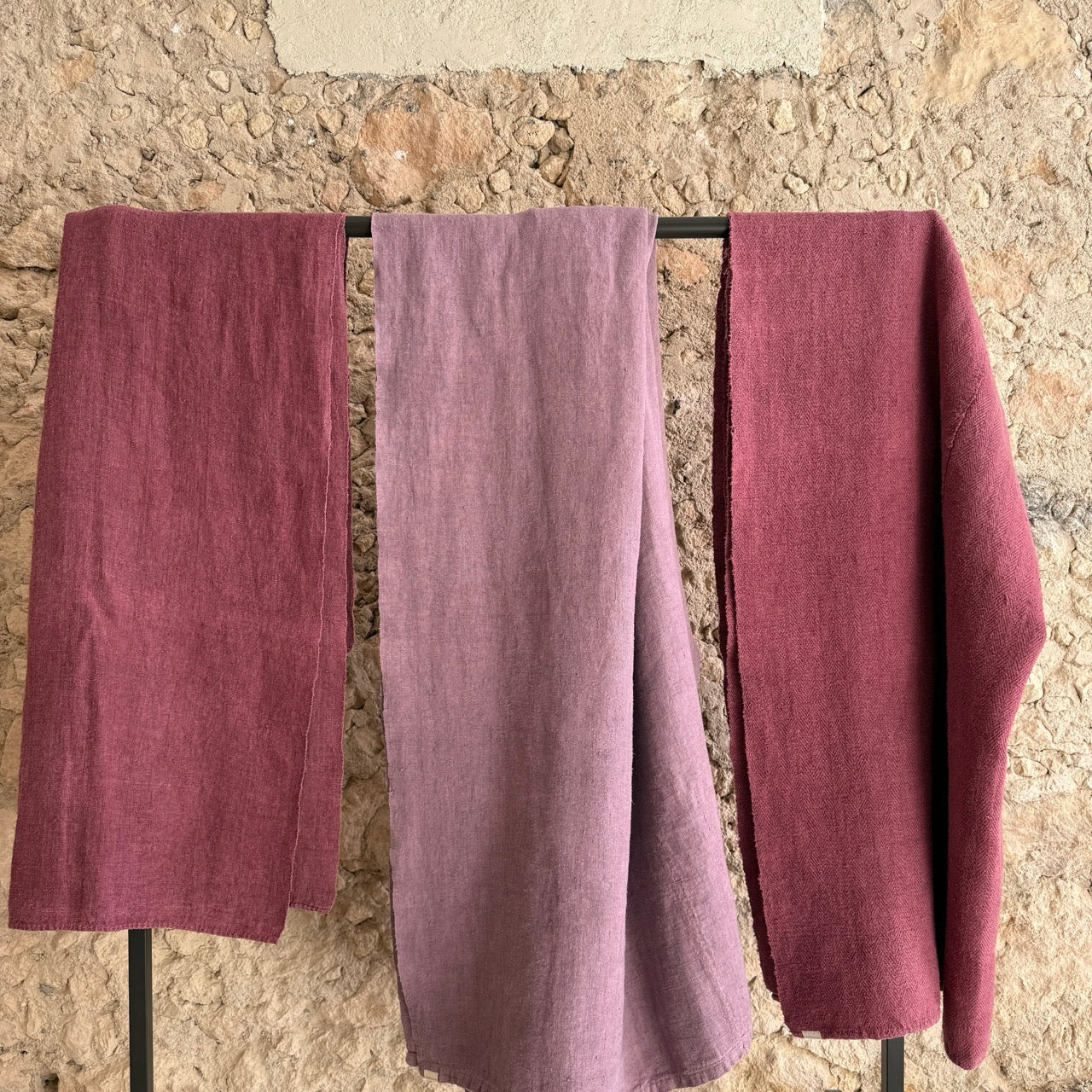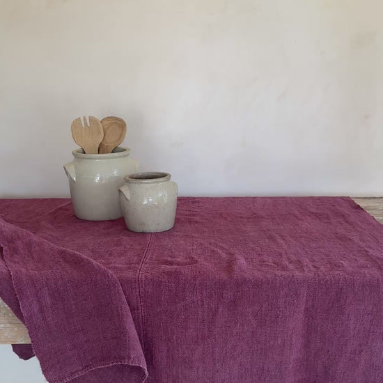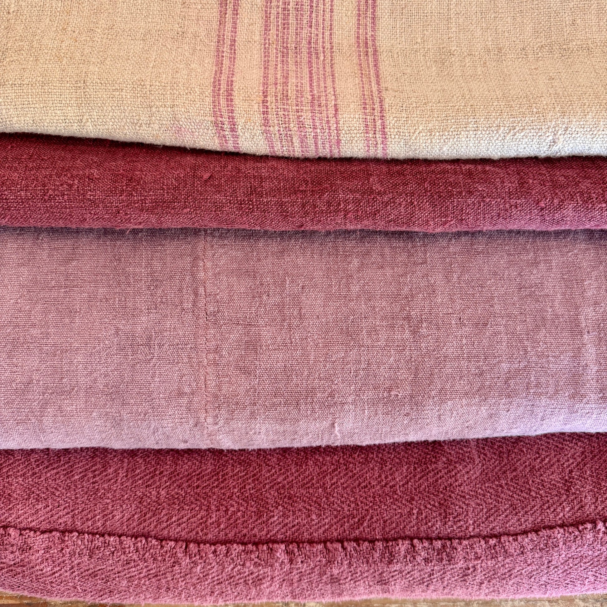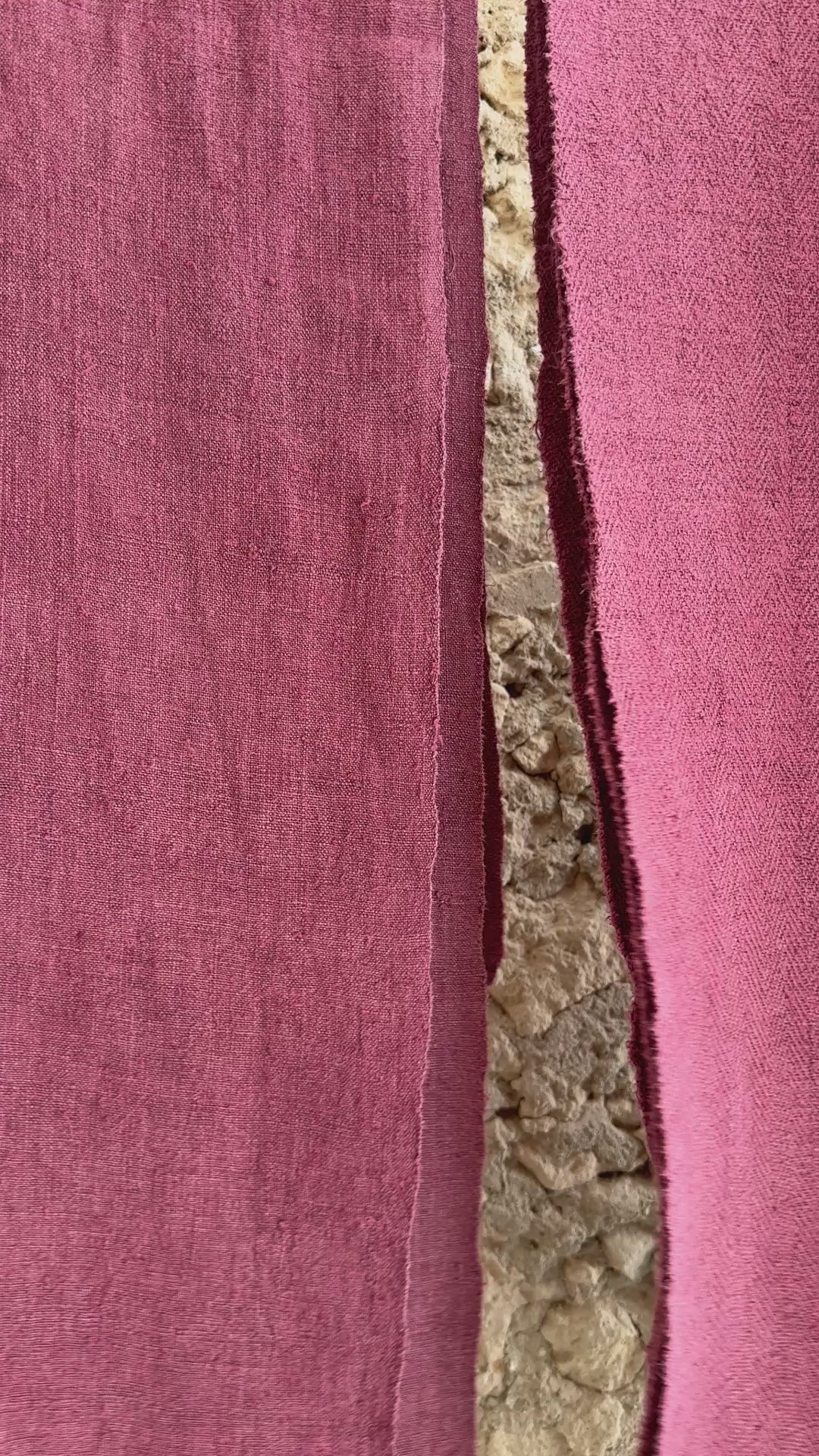 Lino vintage en un delicado tono rosado, ideal como mantel para el comedor, como colcha para una cama individual o como plaid en un sofá. Su textura envejecida aporta una caída natural con un aire rústico y elegante.