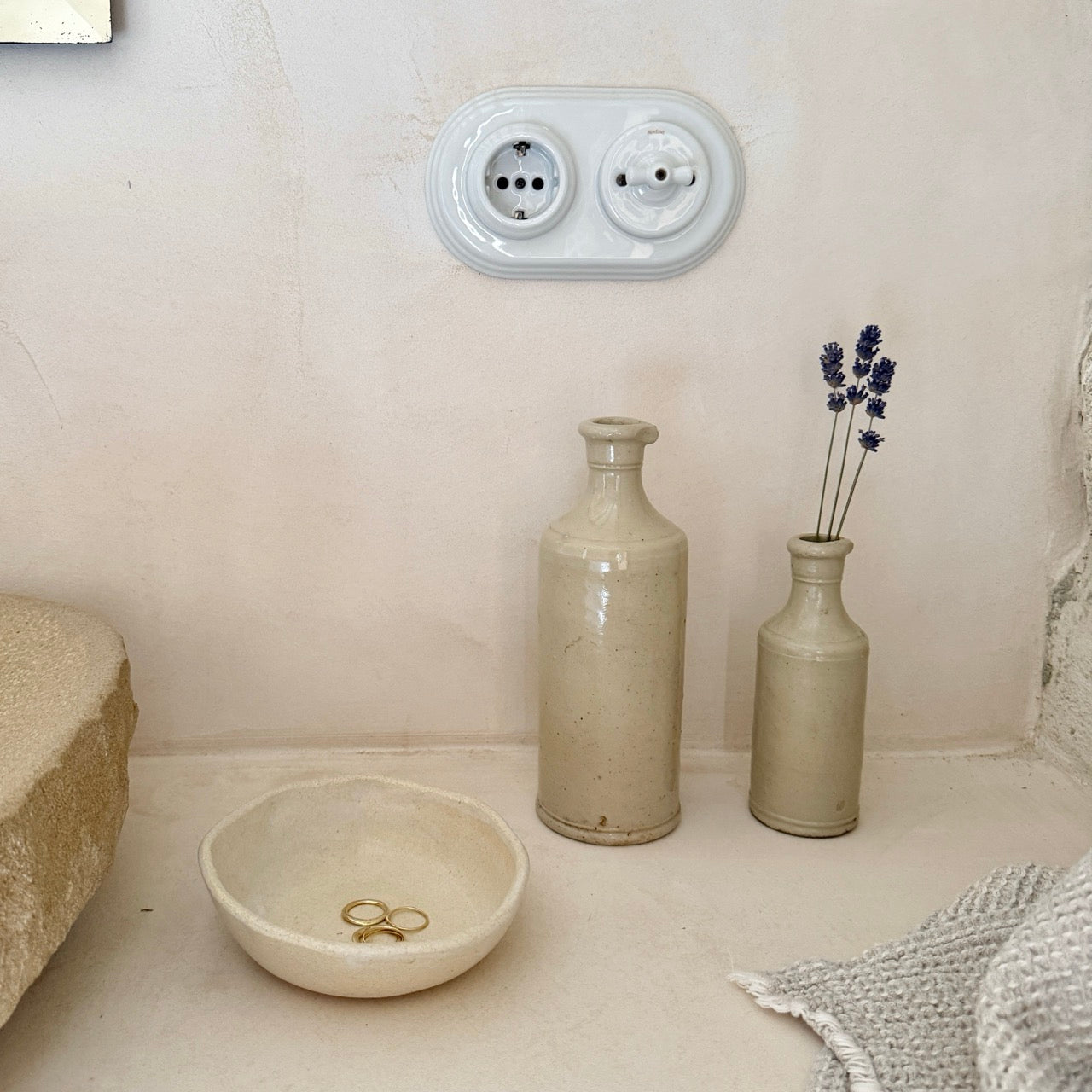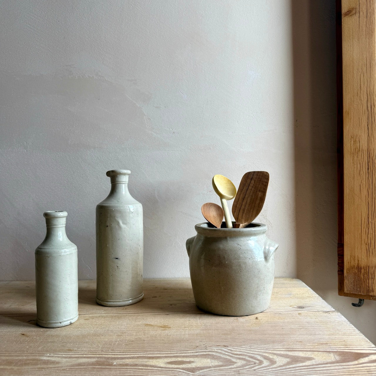 Conjunto de dos jarrones de gres vintage. Estas piezas son antiguos recipientes de tinta transformados en piezas decorativas. Su diseño sencillo y elegante los convierte en objetos atemporales, perfectos tanto para decorar con una flor seca como para destacar por sí solos. El tono beige del gres los hace muy fáciles de combinar en cualquier espacio.