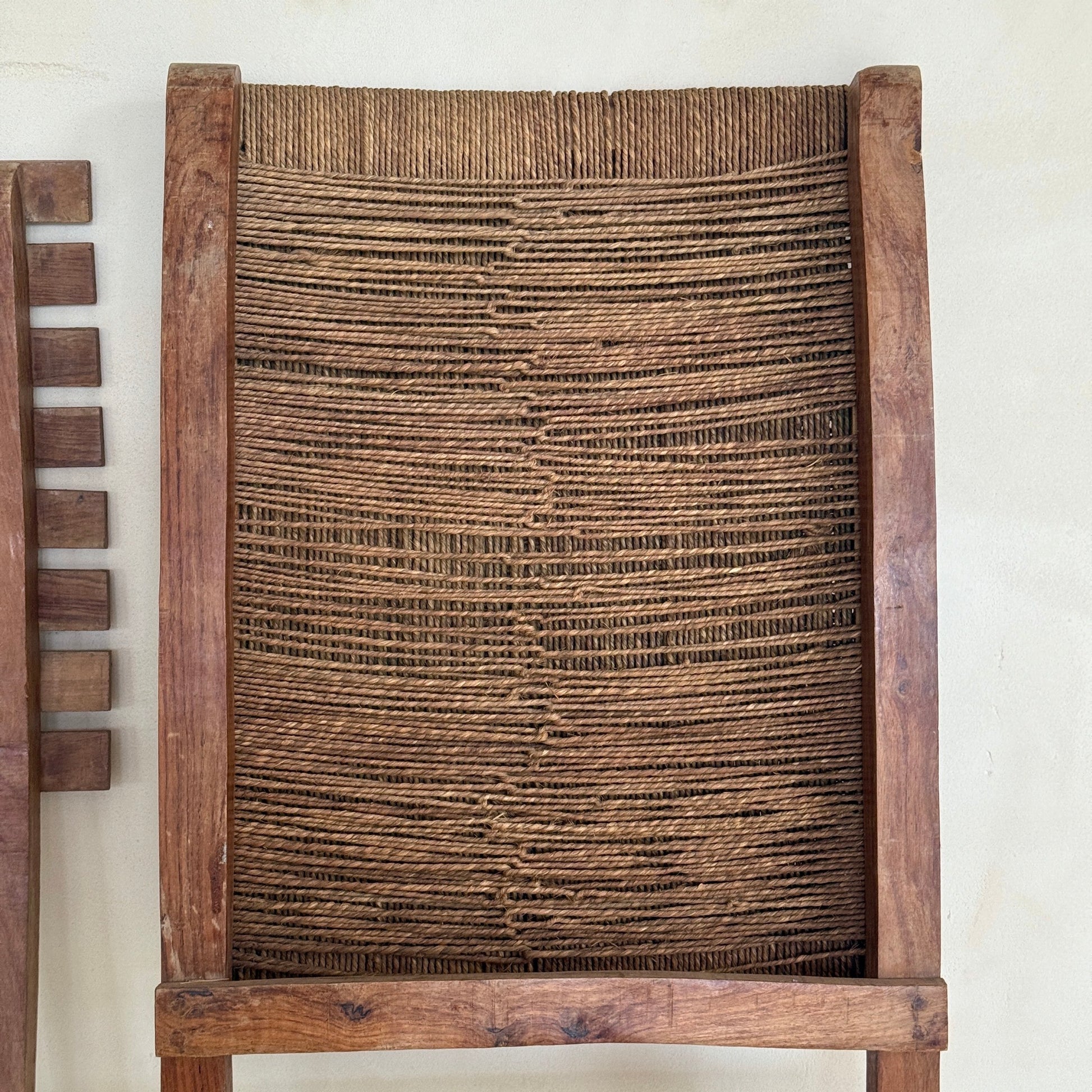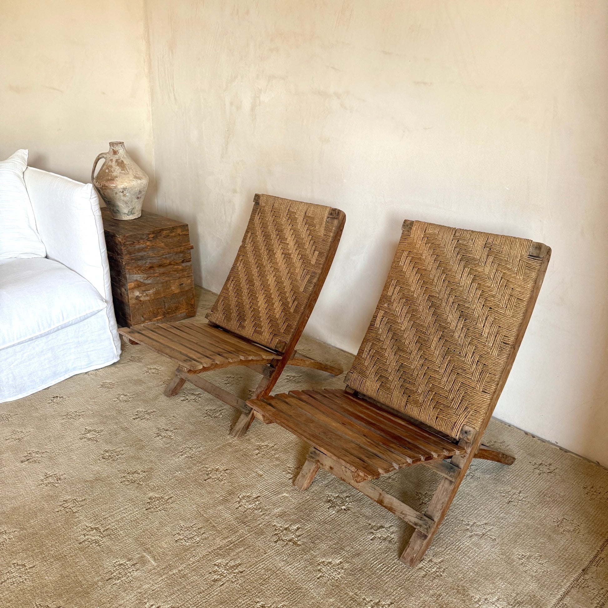 Conjunto de dos sillas de madera y ratán vintage plegables. Estas piezas destacan por la belleza de su aparente sencillez: la calidez de la madera oscura combinada con el entramado artesanal de ratán en el respaldo, creando un equilibrio perfecto entre naturalidad y elegancia.