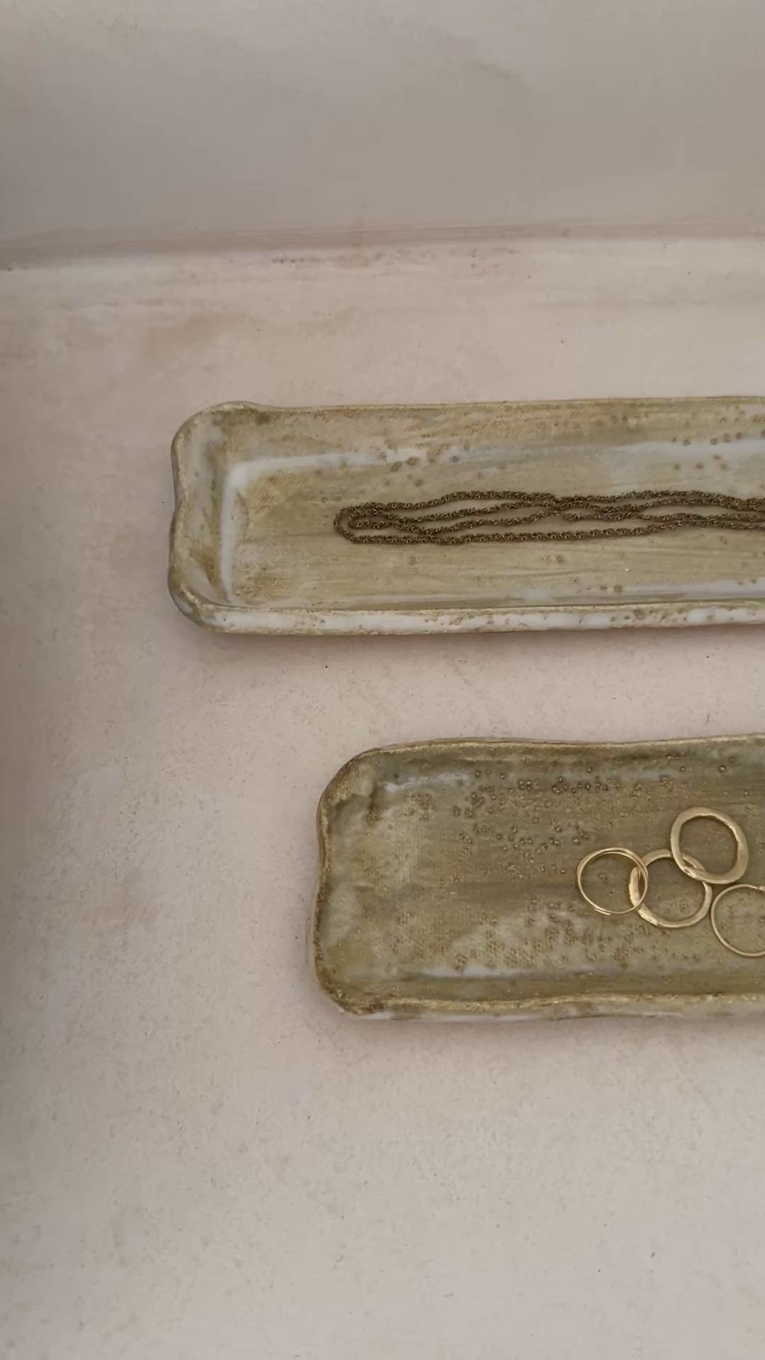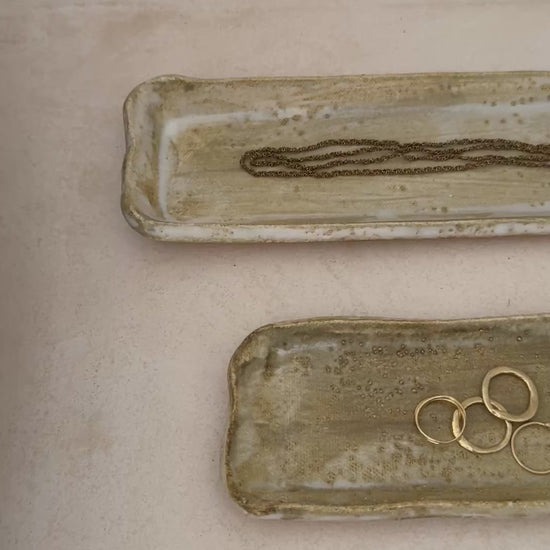 Conjunto de dos bandejas de cerámica hechas a mano por un ceramista en Mallorca. Estas piezas de linea tan delicada son elegantes y sofisticadas ideales como piezas decorativas o joyeros. Están hechas con un esmalte apto para comida por lo que también son perfectas para servir aperitivos en comidas y cenas.