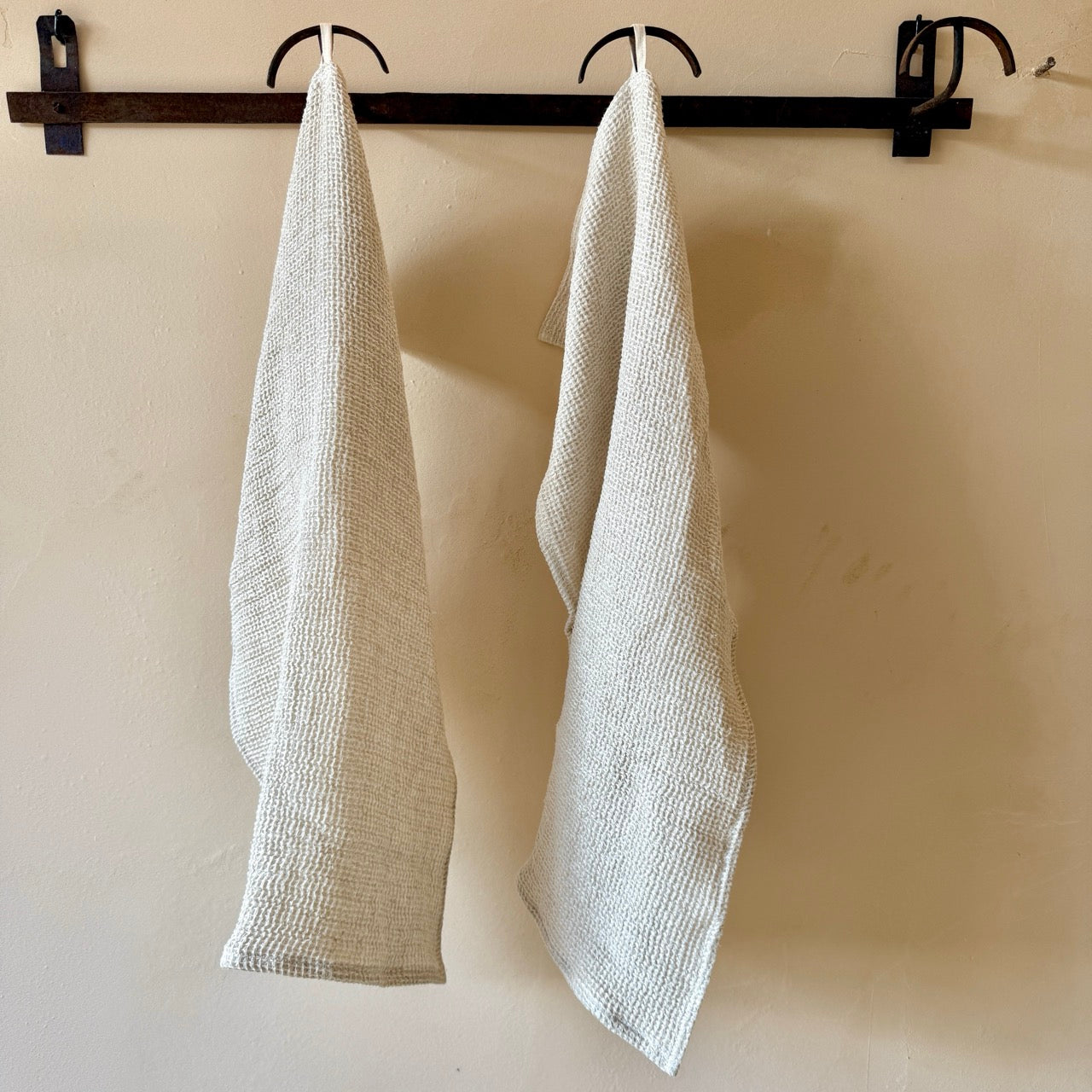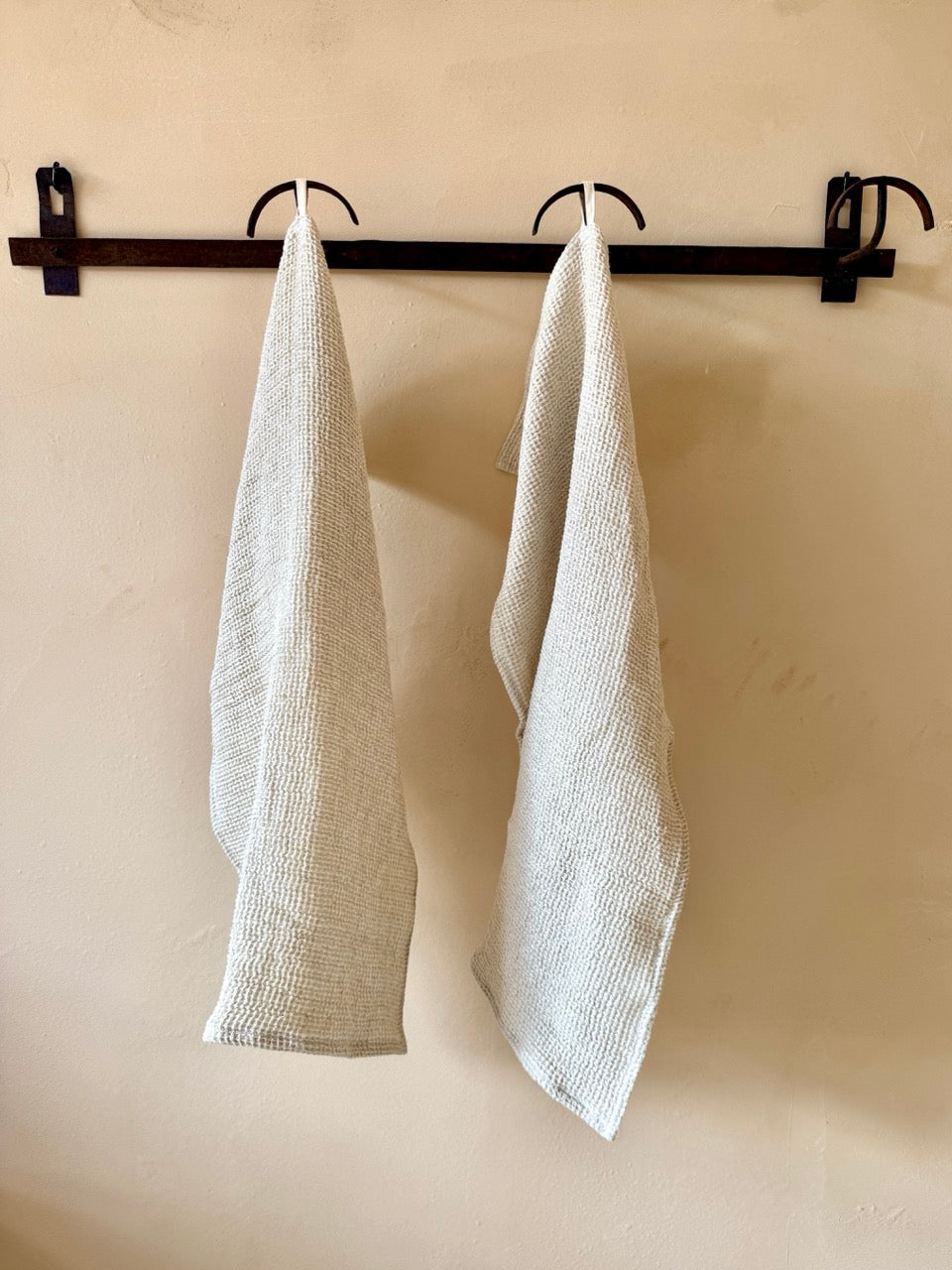 Toalla de mano con efecto waffle de en lino de alta calidad y elaborada a mano por una fundación sin ánimo de lucro que favorece la inserción laboral a personas con capacidades diferentes. Estas toallas son ideales para un aseo o incluso como trapo de cocina.